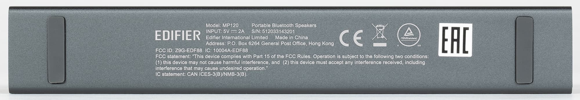 На нижнюю грань нанесена краткая информация об устройстве — от названия модели до логотипов систем сертификации. Там же мы видим две силиконовые ножки, обеспечивающие устойчивость Edifier MP120 и слегка снижающие уровень нежелательных вибраций.