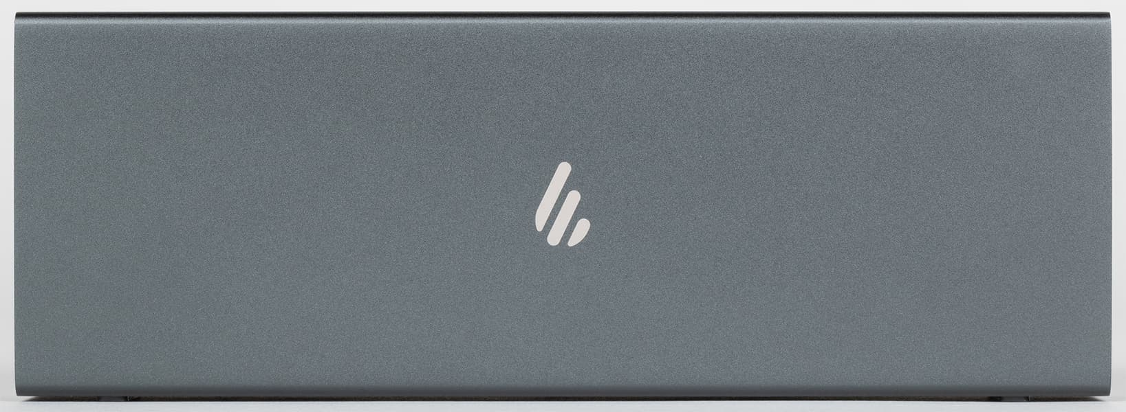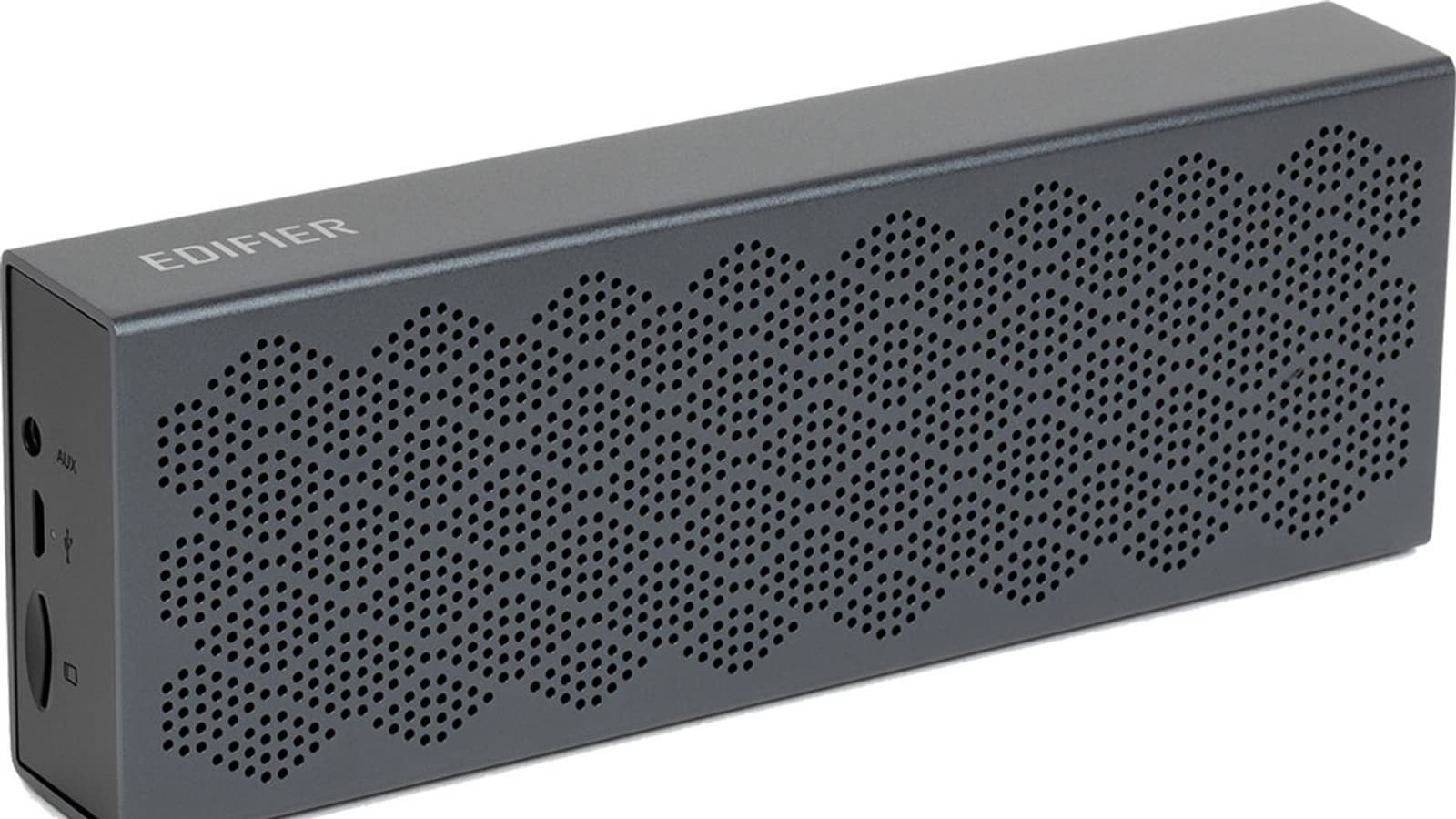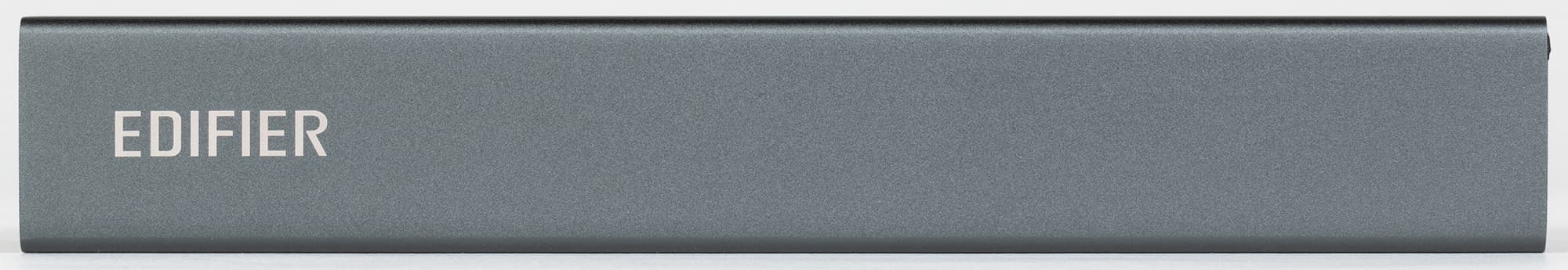 Корпус Edifier MP120 выполнен из алюминия и покрашен в темно-серый цвет. Выглядит он строго, но при этом очень стильно — на уровне так называемых «премиальных продуктов». Торцы пластиковые, на левом размещена панель с разъемами.