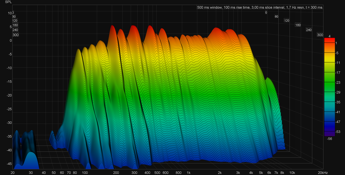 На громкости выше средней колонка основательно вибрирует в такт басовым партиям, низкочастотный диапазон довольно гулкий, что хорошо видно по графику кумулятивного затухания спектра (он же «водопад» или waterfall). Но тут вновь нужно вспомнить, что речь идет о маленькой колонке массой 100 г — в данном случае борьба явно шла не за качество баса, а за сам факт его наличия.