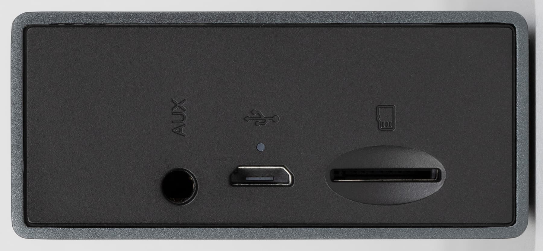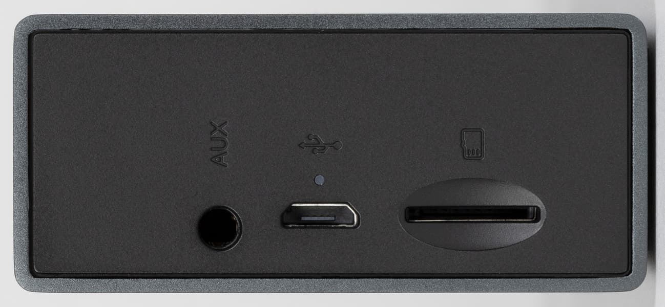Разговор про подключение начнем с левой боковой панели, где размещен вход Aux для проводного соединения с источником звука. Правда, соответствующего кабеля в комплекте нет — придется найти его самостоятельно. Далее мы видим разъем Micro-USB для зарядки с индикатором ее старта и окончания. И вот Micro-USB, конечно, немного расстроил. Да, анонсирована колонка некоторое время назад, но все же USB Type C тоже появился далеко не вчера... В общем, заряжать колонку и современный смартфон одним кабелем не получится, что очень жаль. Ну и далее мы видим разъем для подключения карт microSD. Предельный объем накопителя и требуемую файловую систему производитель не оговаривает, но можем сказать, что карта объемом 32 ГБ, отформатированная в FAT32, прочиталась без проблем.