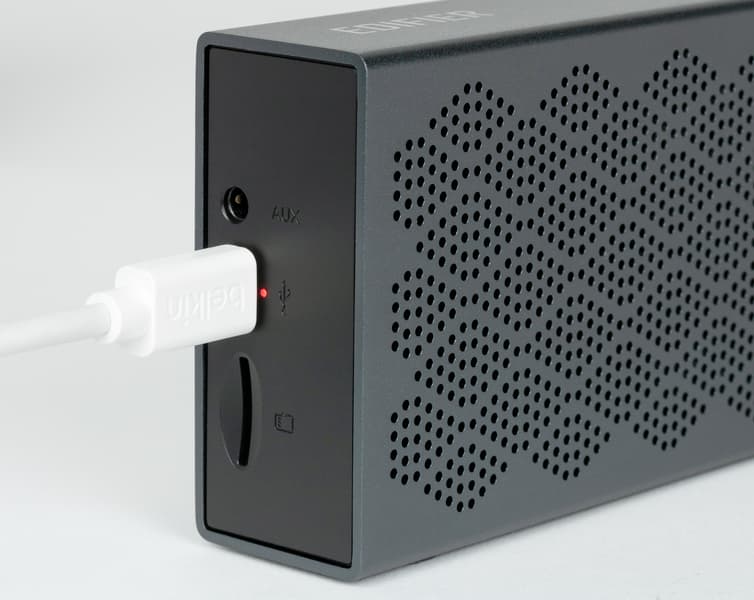 Судя по описанию от производителя, в MP120 установлен аккумулятор емкостью 2200 мА·ч, способный обеспечить воспроизведение музыки в течение 19 часов — очень солидный показатель. Но тут все, конечно, сильно зависит от громкости. У нас на громкости чуть ниже средней колонка проработала даже больше — около 21 часа. В общем, хватит надолго. Индикатор возле порта Micro-USB горит красным при зарядке и выключается, когда она завершена.