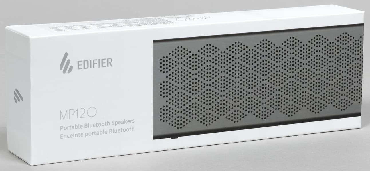 Поставляется колонка в белой картонной коробке со съемной крышкой, на которую нанесены логотип производителя, изображение устройства и его краткие характеристики. Выглядит упаковка не слишком броско, но при этом привлекательно. Внутри колонка помещена в пластиковый пакет, плотность картона частично компенсирует отсутствие фиксирующего ложемента — за сохранность Edifier MP120 при транспортировке можно не переживать, учитывая выполненный из металла корпус.