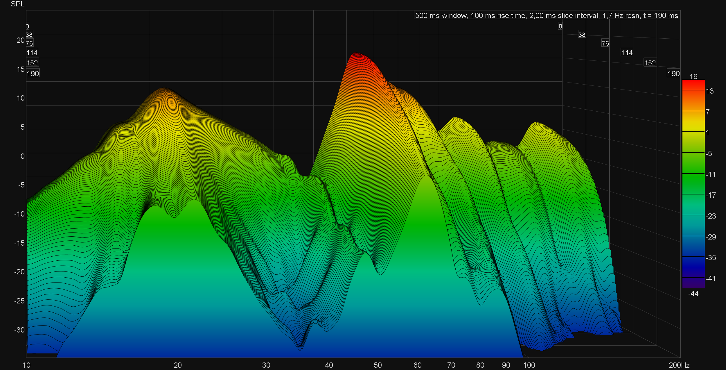 На «водопаде» хорошо видно, что звучание делают хуже резонансы помещения — все увиденные ранее пики стали еще более выраженными.