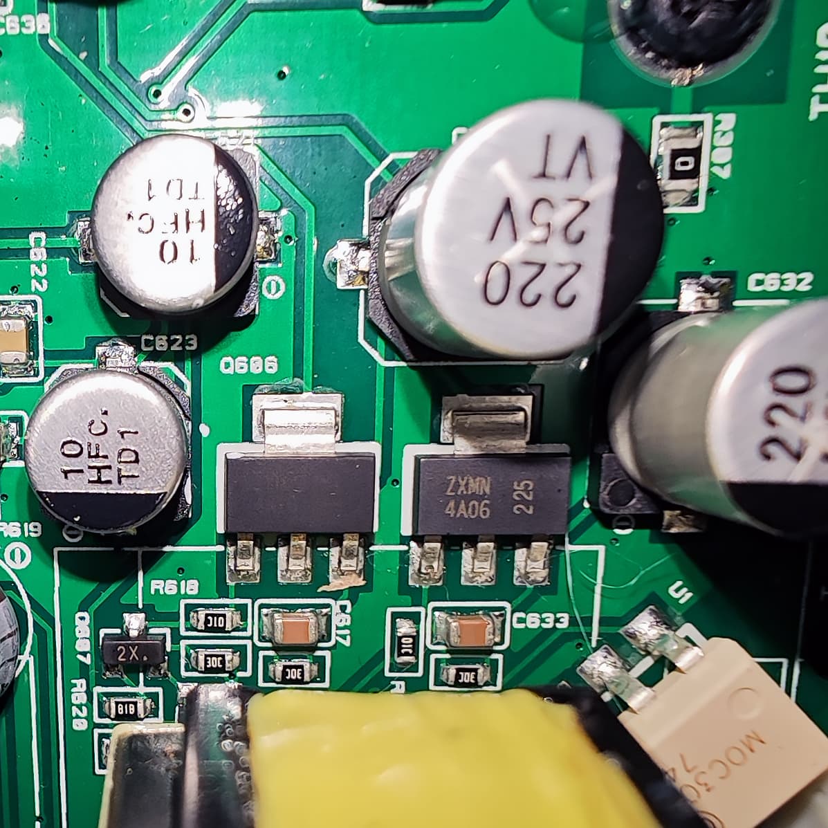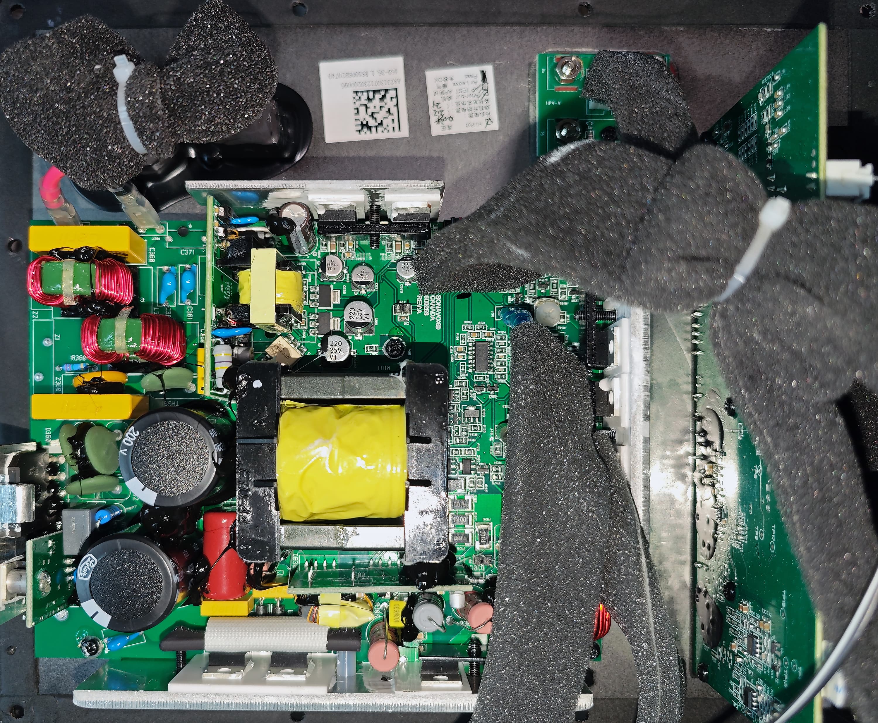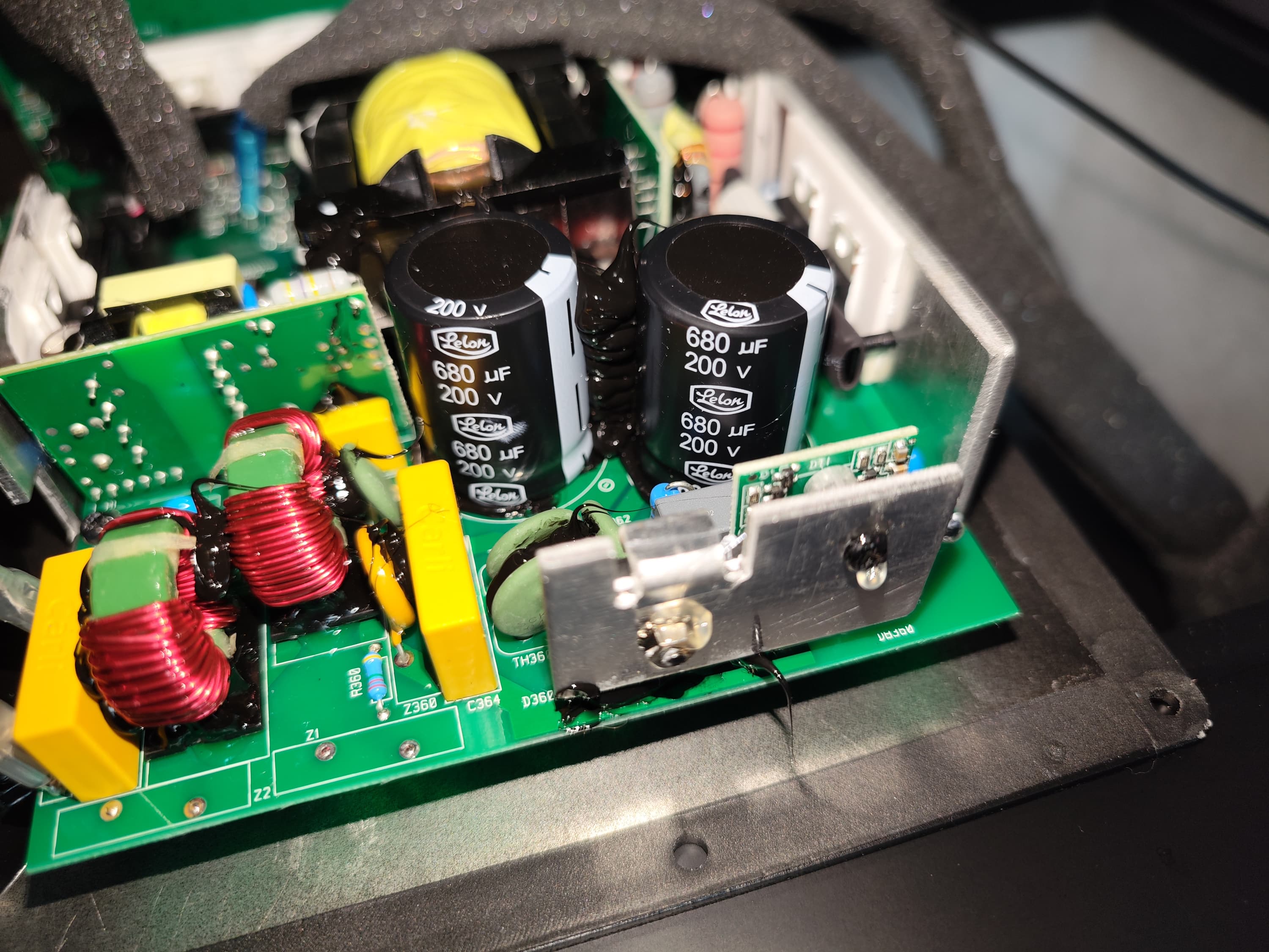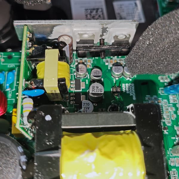 К сожалению, маркировка на самых интересных деталях скрыта за радиаторами охлаждения, снять которые сложновато — многие компоненты обильно залиты компаундом, при дальнейшей разборке устройства есть риск его повреждения.