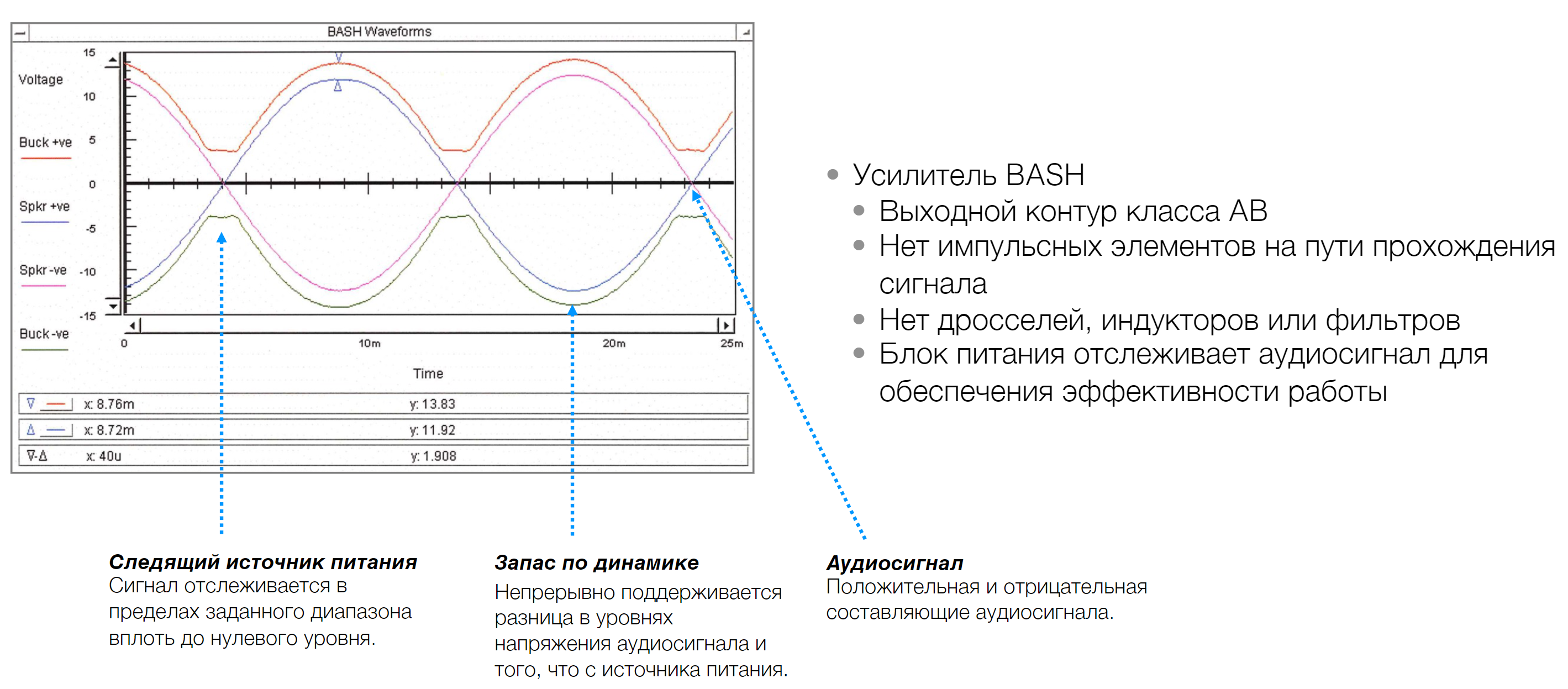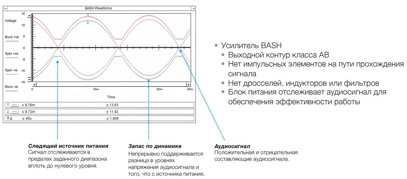 Но самое интересное тут не в различиях, а наоборот — в общих чертах, то есть задействованных технологиях. Во всех моделях используется усилитель класса AB, оснащенный импульсным блоком питания, выходное напряжение которого изменяется в зависимости от входящего аудиосигнала — производитель называет эту технологию BASH (Bridged Amplifier Switching Hybryd). Она позволяет чище отрабатывать значительные пики сигнала и повышает энергоэффективность.