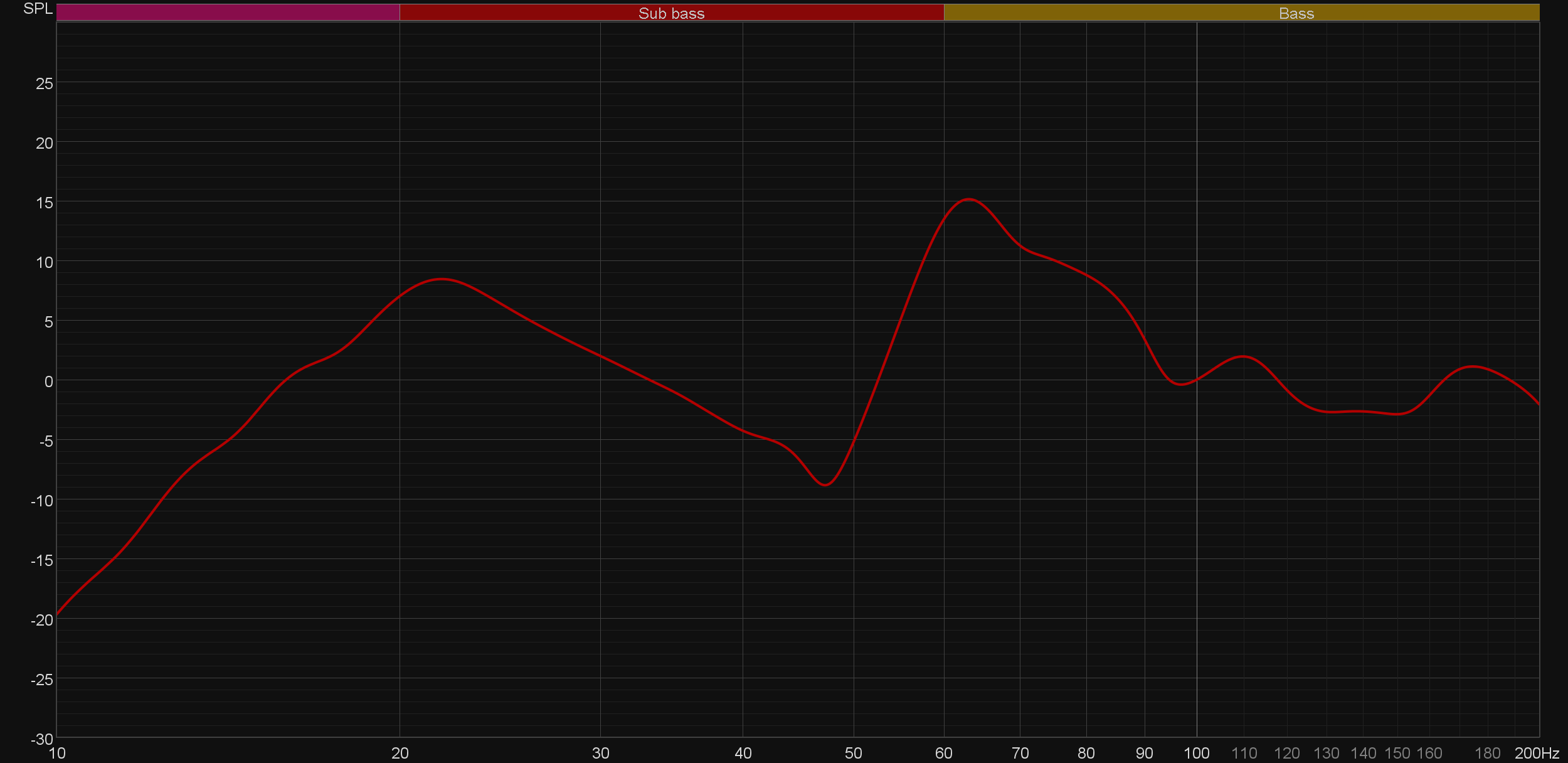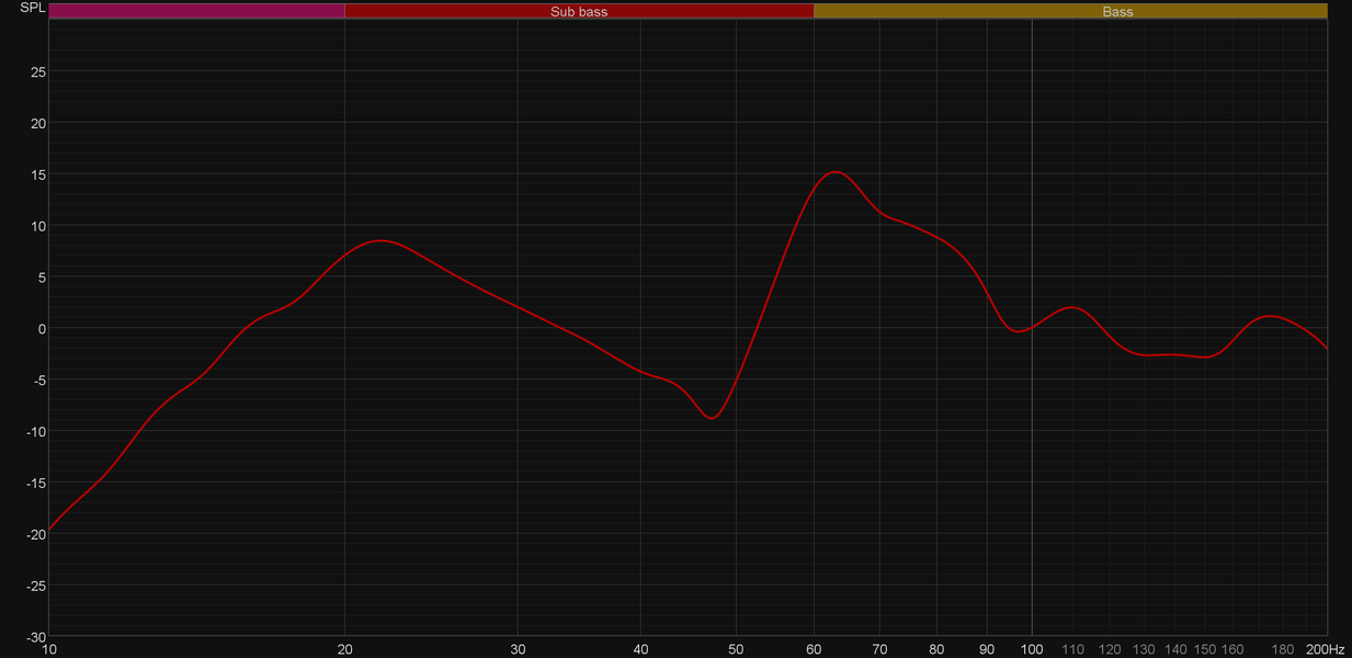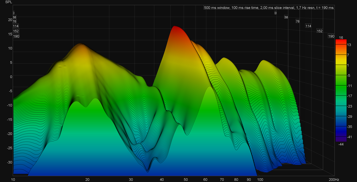 Заявлено, что звучать сабвуфер начинает от 15 Гц — где-то так и получается, но полной эффективности он достигает примерно к 45 Гц. На графике кумулятивного затухания спектра (он же «водопад» или waterfall) хорошо видны пики, показывающие нам «гудение» в районе 20 и 65 Гц. Частично этот эффект может быть вызван внутренними резонансами корпуса, возникающими даже вопреки действительно хорошему акустическому демпфированию. Ну а вот вторым пиком мы с большой долей вероятности обязаны не самому удачному размещению.