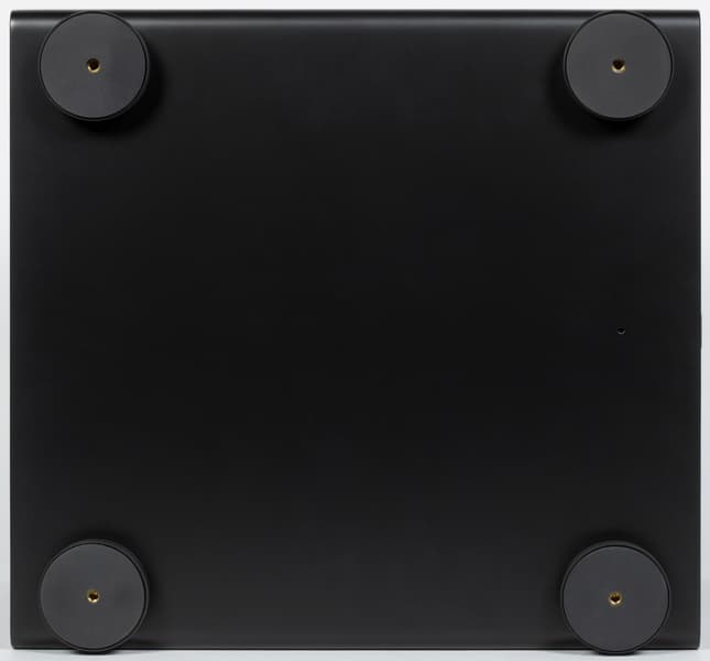Далее мы видим регулятор громкости — валкодер с дискретным ходом без ограничения угла вращения. Других органов управления на задней стенке нет — все «продвинутые» опции Varro Reference RS500 активируются и настраиваются из приложения. Порт USB служит для обновления прошивки, расположенные рядом вход триггера 12 В и порт Ethernet — для интеграции в системы управления. В правом нижнем углу размещены разъем для кабеля питания и клавиша включения устройства.