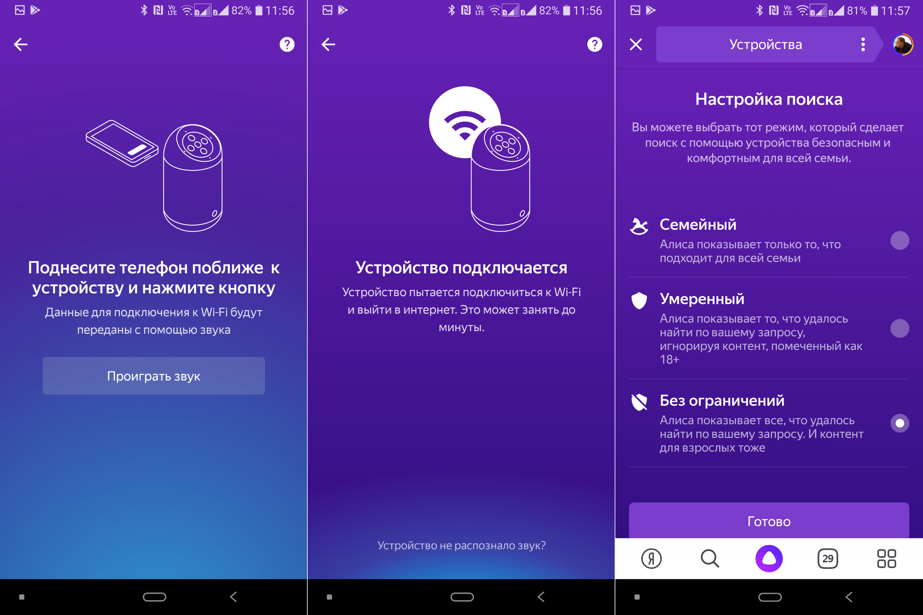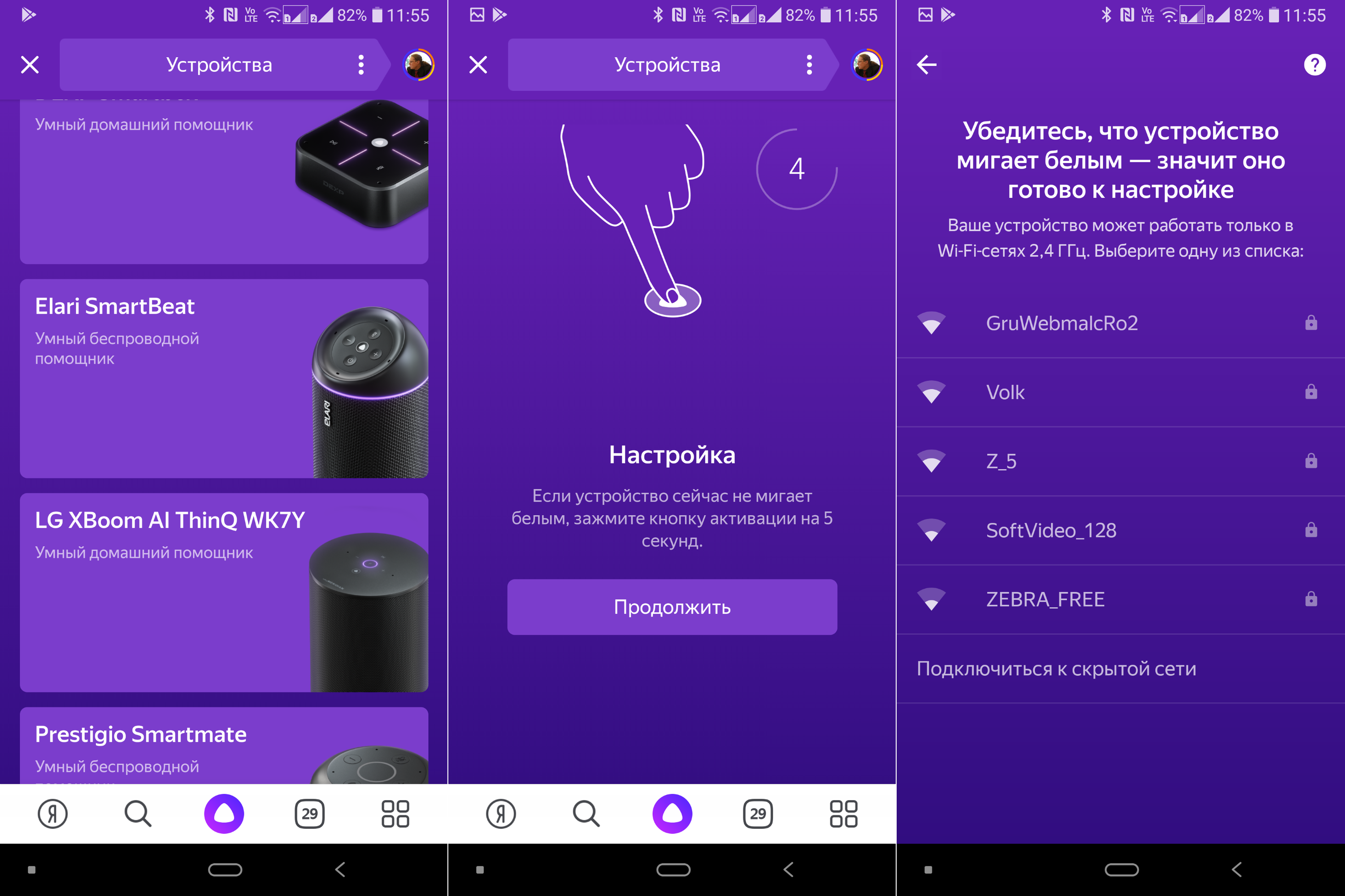 Подключение и настройка SmartBeat практически не отличается от того, что мы уже видели у ее «коллег» с голосовым помощником Алиса. При первом включении она достаточно подробно рассказывает, что и как нужно сделать. Для начала ставим приложение «Яндекса», заходим в раздел с устройствами. Выбираем нашу колонку, далее включаем режим подключения и выбираем сеть.