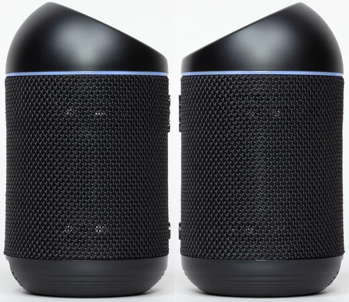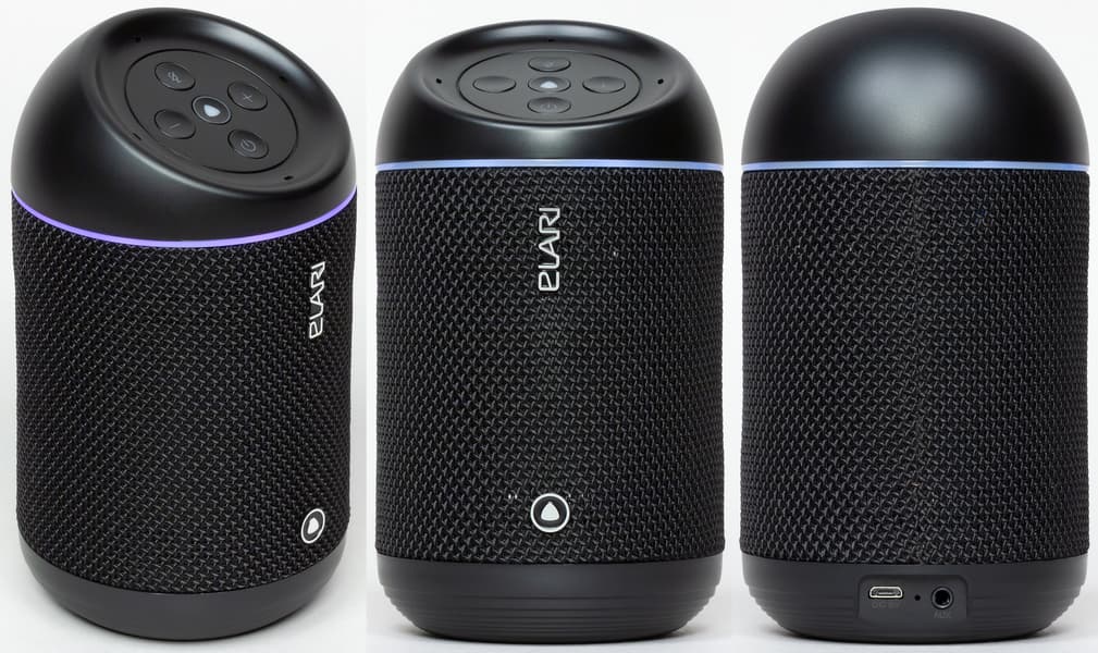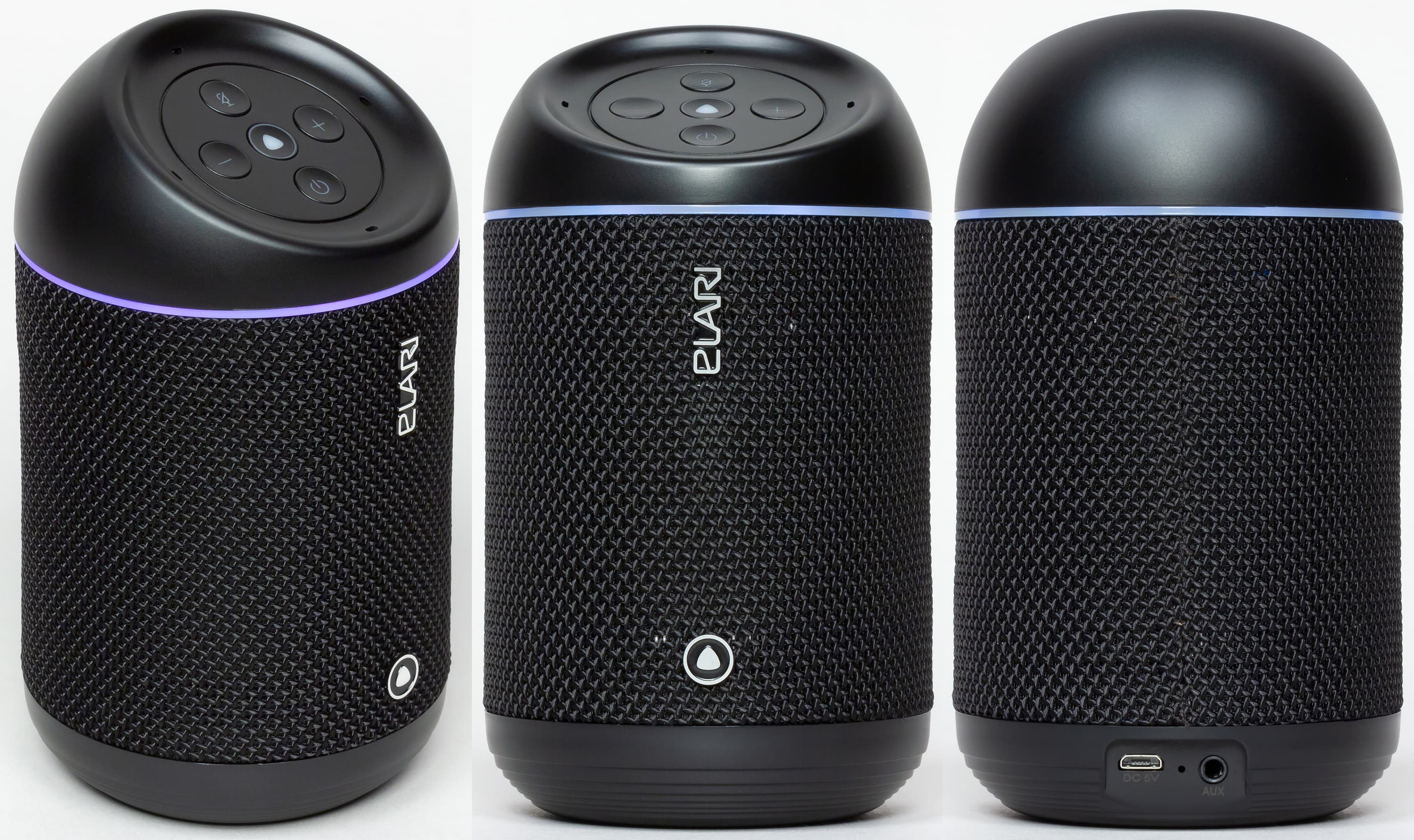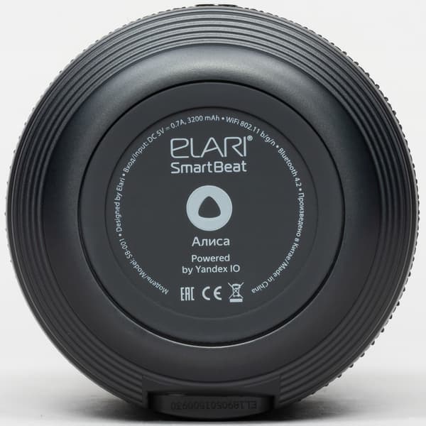 Верхний торец устройства «срезан» под углом, над сеткой расположен световой индикатор, опоясывающий всю колонку. Он светится фиолетовым, когда Elari SmartBeat «слушает» пользователя и синим при воспроизведении через Bluetooth-подключение. При регулировке громкости индикатор постепенно меняет цвет от зеленого до красного, а если в ходе работы что-то идет не так — дает об этом знать красным свечением.