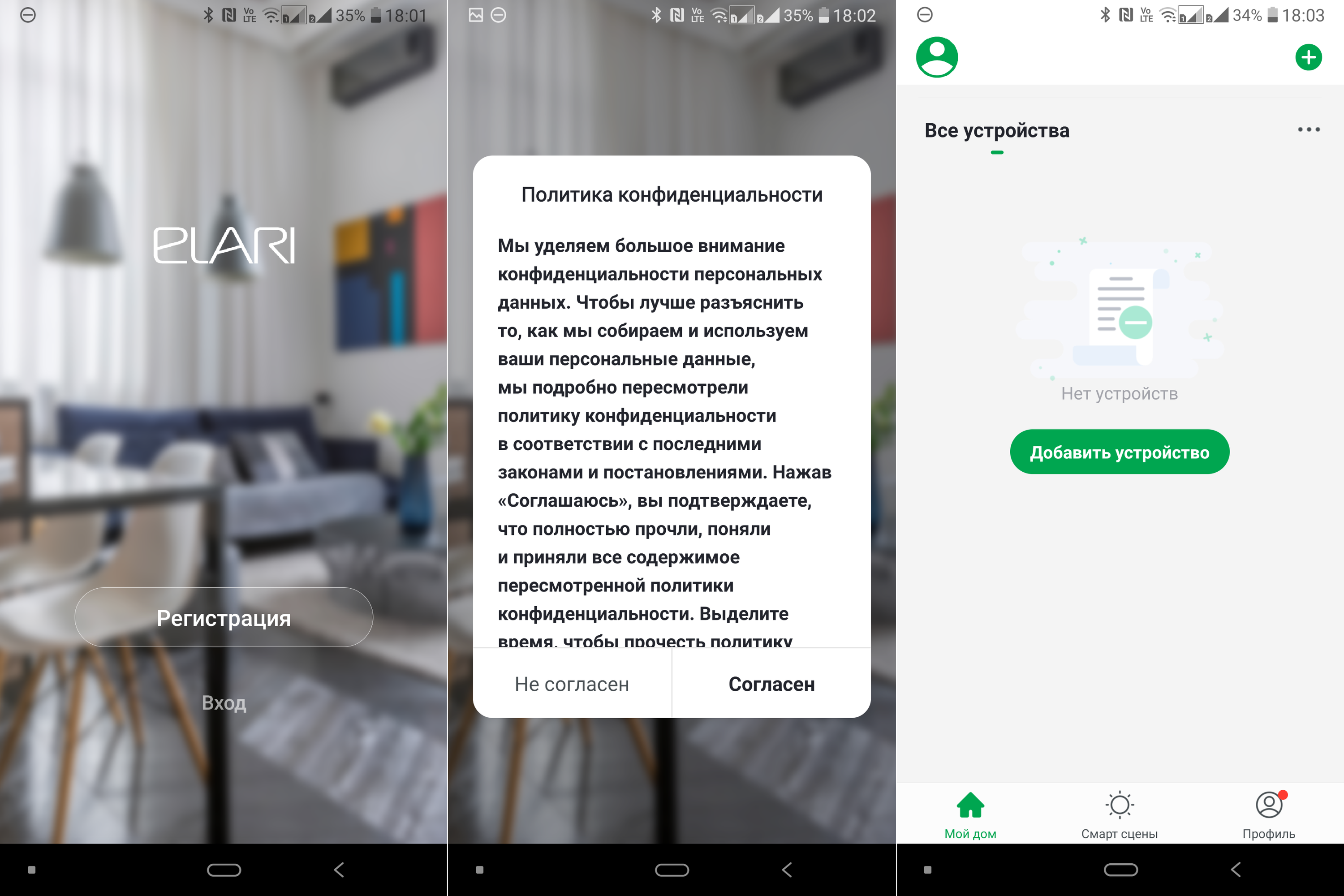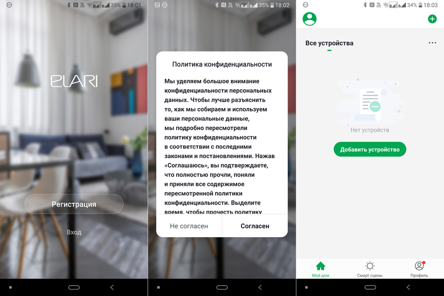 Настройка элементов «умного» дома Elari производится через фирменное приложение SmartHome, начинать в любом случае нужно с него — даже если в будущем планируется пользоваться исключительно ПО и голосовым помощником «Яндекса». Заходим, регистрируемся. Авторизация возможна как по номеру телефона, так и по адресу электронной почты. Однако при связывании аккаунтов в SmartHome и «Яндексе» в любом случае понадобится телефон — есть смысл сразу ввести его. После того как этап авторизации пройден, пользователь попадает в раздел подключенных устройств, где есть возможность добавить новое.