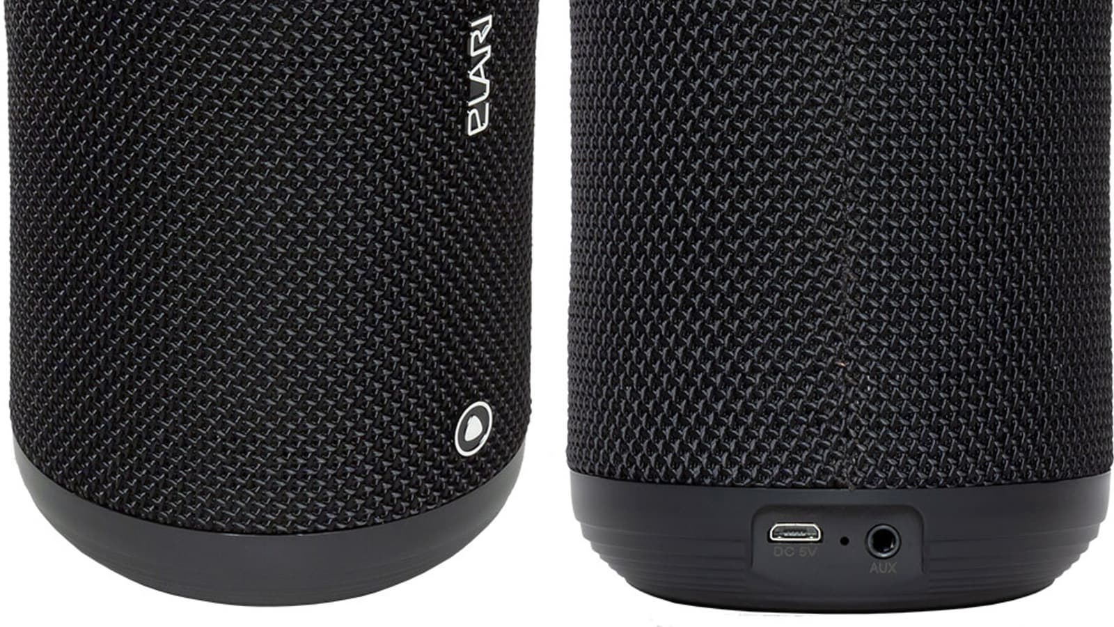 Размеры колонки сравнительно невелики — чуть крупнее кружки для чая. Корпус округлый, вся боковая поверхность закрыта сеткой. На передней части расположены значок голосового помощника Алиса и логотип Elari.