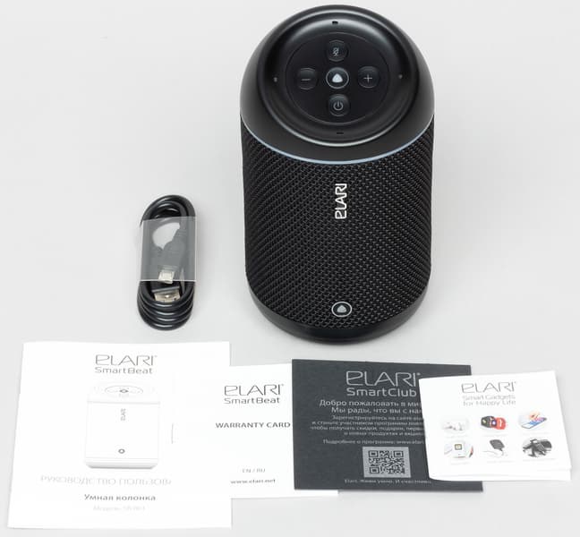 В комплект поставки входят сама колонка, кабель Micro-USB для зарядки и печатные материалы. Собственного зарядного устройства нет, а кабель довольно короткий (80 см), что несколько ограничивает возможности стационарного использования.