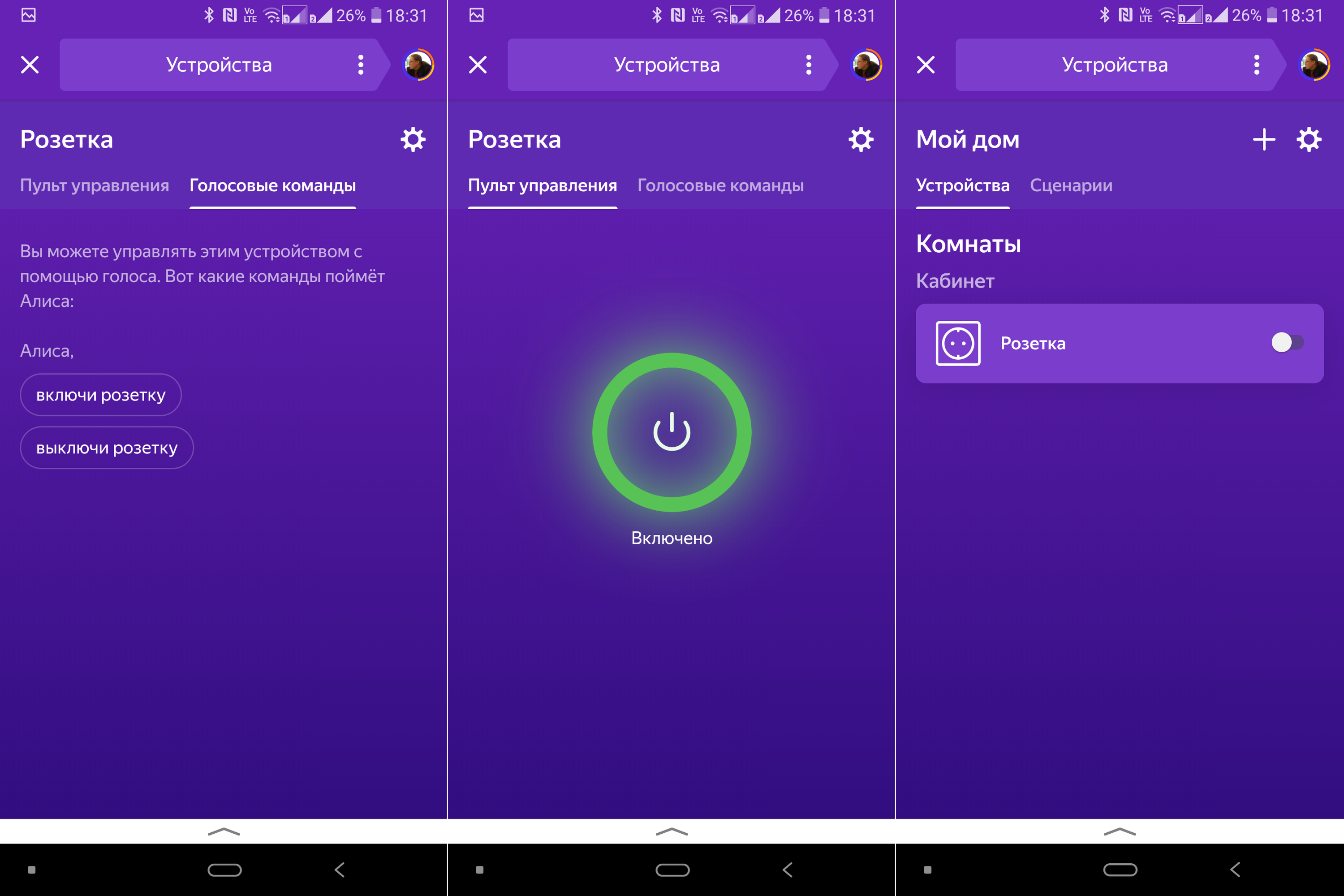 На собственной вкладке устройства можно посмотреть доступные голосовые команды, а также непосредственно осуществлять управление. В случае с розеткой вариантов, конечно, немного: включить и выключить.