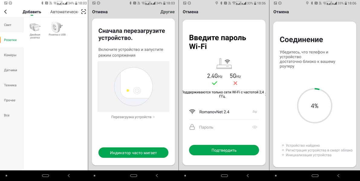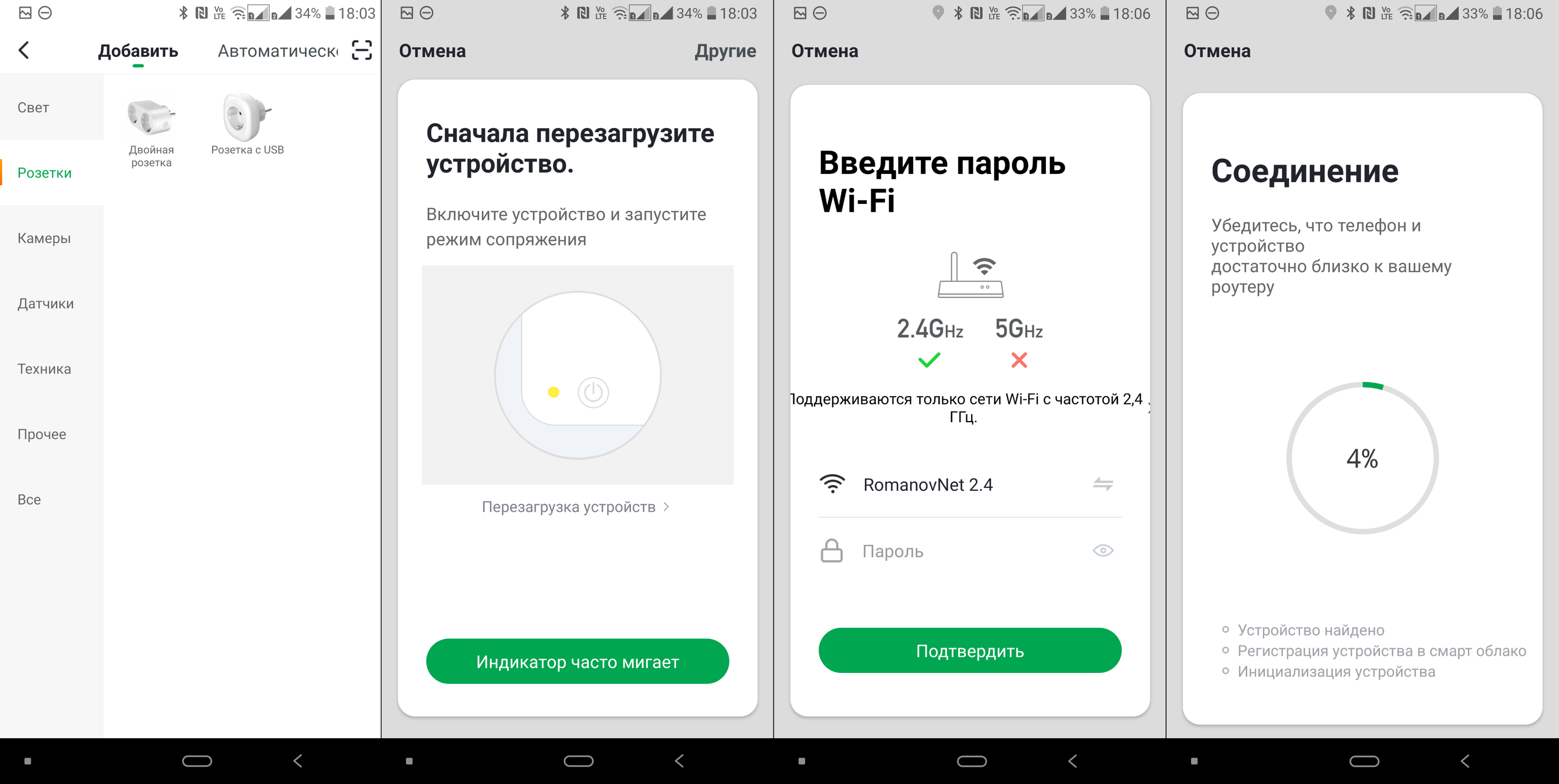 В меню выбираем нужное устройство, далее активируем на нем режим сопряжения. У розетки для этого нужно удерживать нажатой единственную кнопку в течение 5 секунд — пока не замигает индикатор. Далее выбираем сеть Wi-Fi. Как и в случае большинства IoT-устройств других производителей, поддерживаются только сети 2,4 Гц, что, конечно, досадно. Выбираем сеть, вводим пароль — устройство начинает процесс подключения, который может занять до 5 минут.