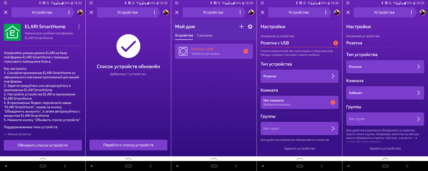 Обновляем список — видим в нем нашу розетку и оповещение о том, что она требует настройки. Вводим название, которое будет использоваться Алисой для идентификации устройства, выбираем его тип, расположение и группу, если в этом есть необходимость.