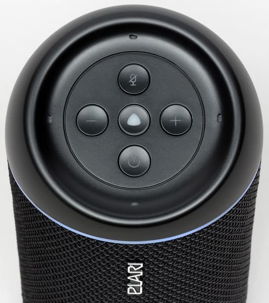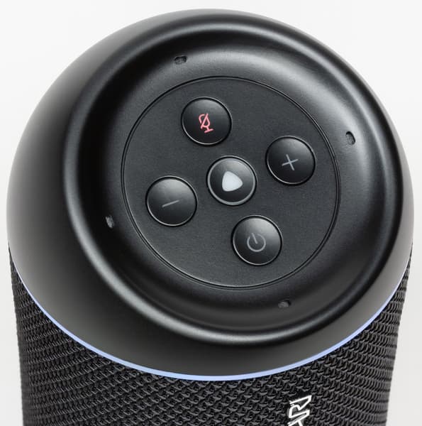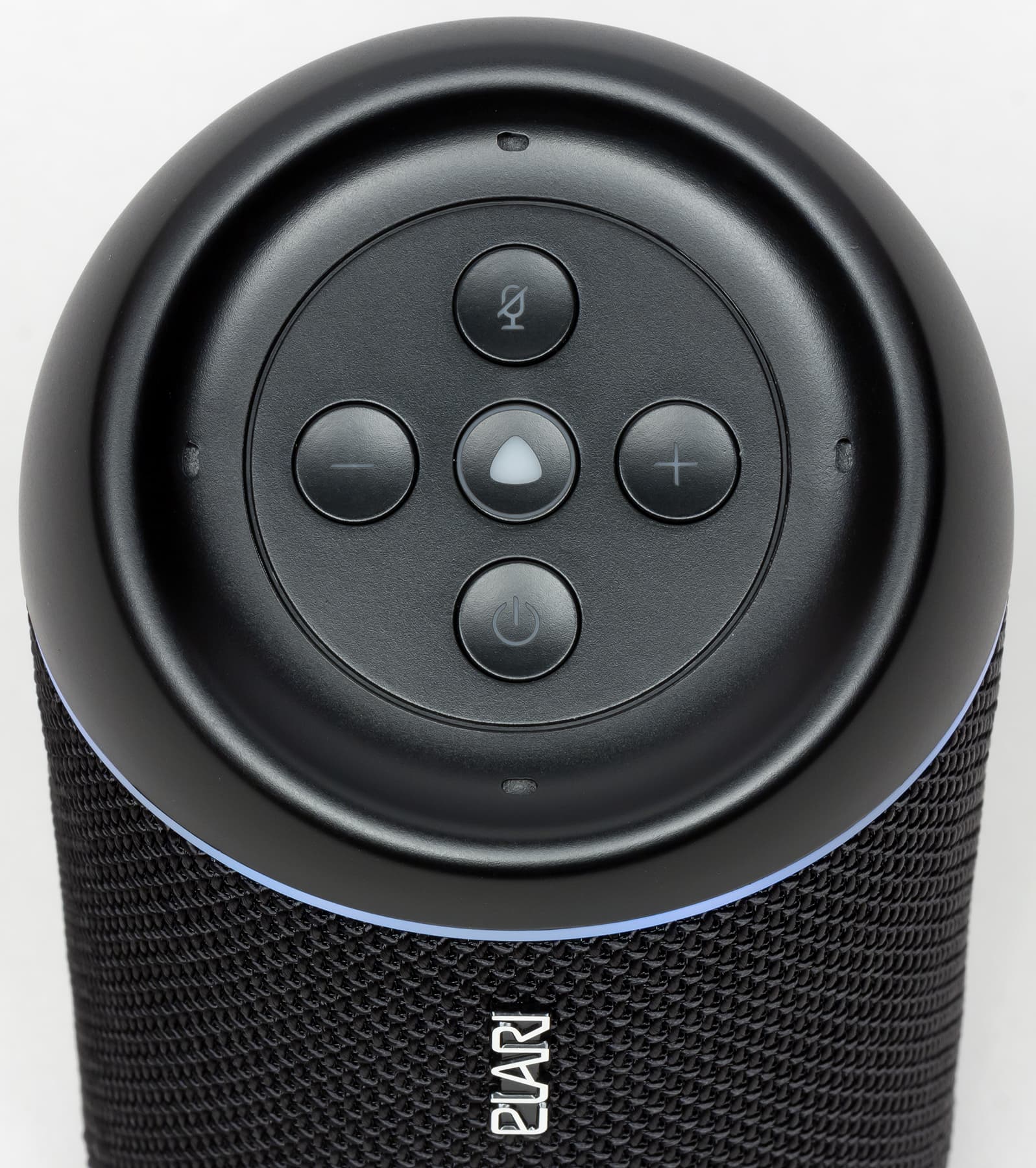 Помимо голосового помощника, для управления устройством можно использовать пять кнопок на верхней панели: включения и выключения, активации голосового ассистента, отключения микрофона, увеличения и уменьшения громкости. Кнопка по центру постоянно подсвечивается, когда колонка включена, и позволяет увидеть остальные в темноте. Правда, при размещении Elari SmartBeat где-нибудь возле кровати, постоянное свечение ночью может несколько раздражать. Также своим светодиодом оснащена кнопка отключения микрофона — при активации этой функции она светится красным.
