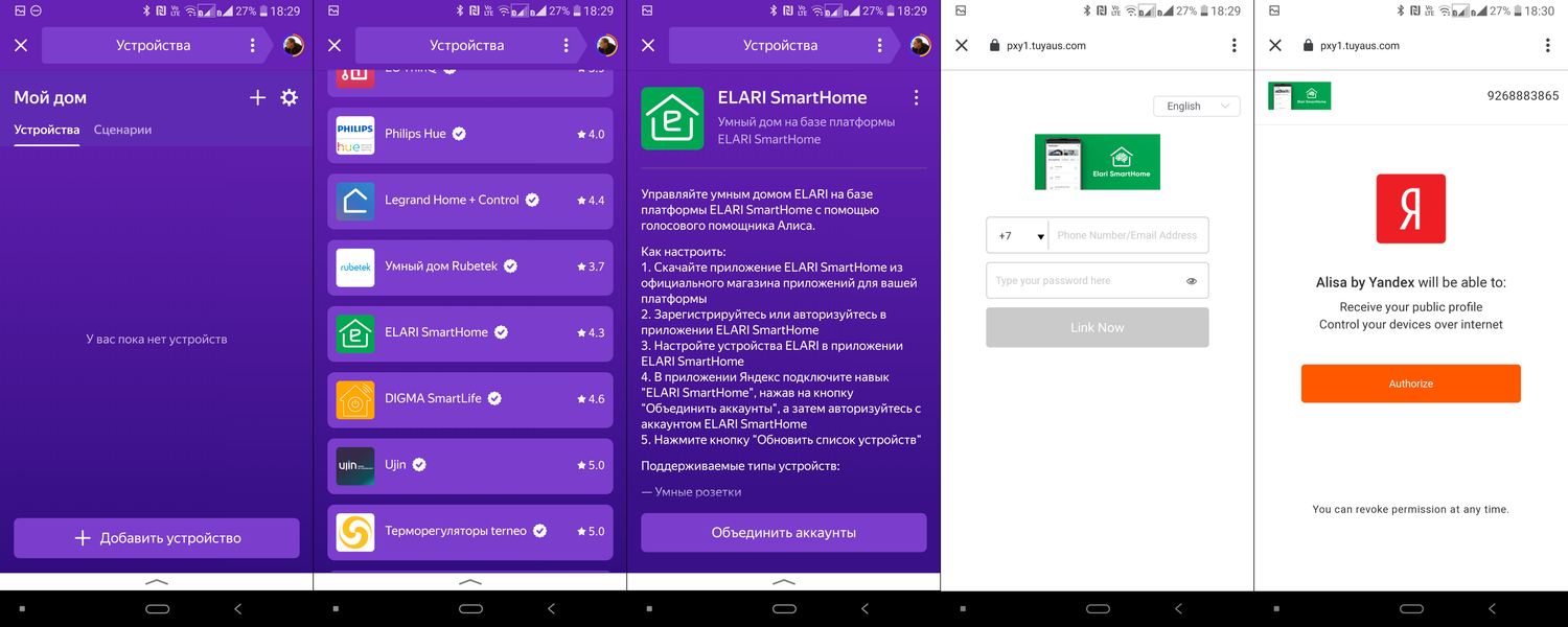 Для управления смарт-устройствами Elari из приложения «Яндекса» и с помощью голосового помощника нужно объединить два аккаунта. Для этого переходим в раздел добавления устройств, в списке производителей выбираем Elari. Авторизуемся с помощью номера телефона. Как уже говорилось выше, в SmartHome можно зарегистрироваться и только с помощью почты, но при объединении аккаунтов все равно потребуется телефон. Остается согласиться с тем, что Алиса «Яндекса» получит доступ к профилю и контролю над устройствами.