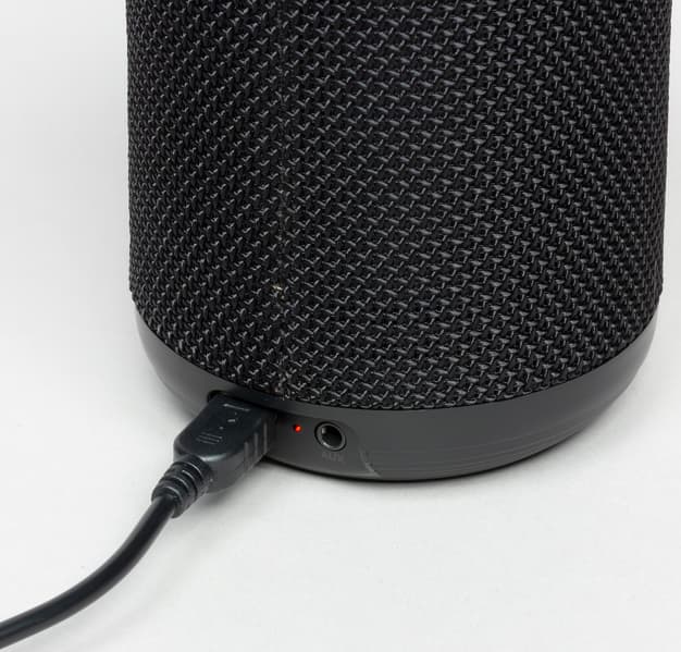 В нижней части колонки расположены индикатор зарядки, а также разъемы Micro-USB и Aux (миниджек 3,5 мм). Кабеля для подключения к последнему, кстати, в комплекте нет.