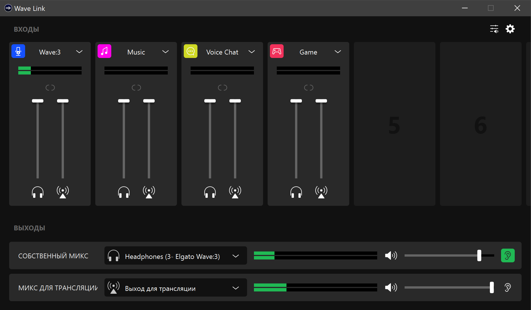 Неопытному пользователю первоначальная настройка может показаться немного сложной, но на деле все очень просто и понятно. Профессиональные виртуальные микшеры обладают гораздо более серьезным набором функций, чем Wave Link. И вот их настройка действительно может вызвать ряд вопросов. ПО же Elgato прекрасно как раз тем, что в нем есть все необходимое для разного рода контентмейкеров, но при этом нет ничего лишнего. В итоге и настраивается всё быстро, и в работе максимально просто и удобно. Первым делом устанавливаем программу и видим главное окно, из которого осуществляется всё управление звуком трансляции или записи.