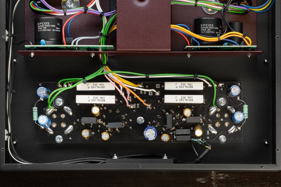 Как и свой интегральный собрат, моноусилитель поставляется в четырех цветовых вариациях: bleach (белая), big calm (бордовая), black ice (черная), burning red (красная). Мы вновь остановились на элегантном черном варианте, способном органично вписаться практически в любой интерьер. Внешне герой сегодняшнего обзора мало отличается от Fezz Audio Mira Ceti 300b — разве что ручек громкости и выбора активного входа на передней панели по понятным причинам нет.