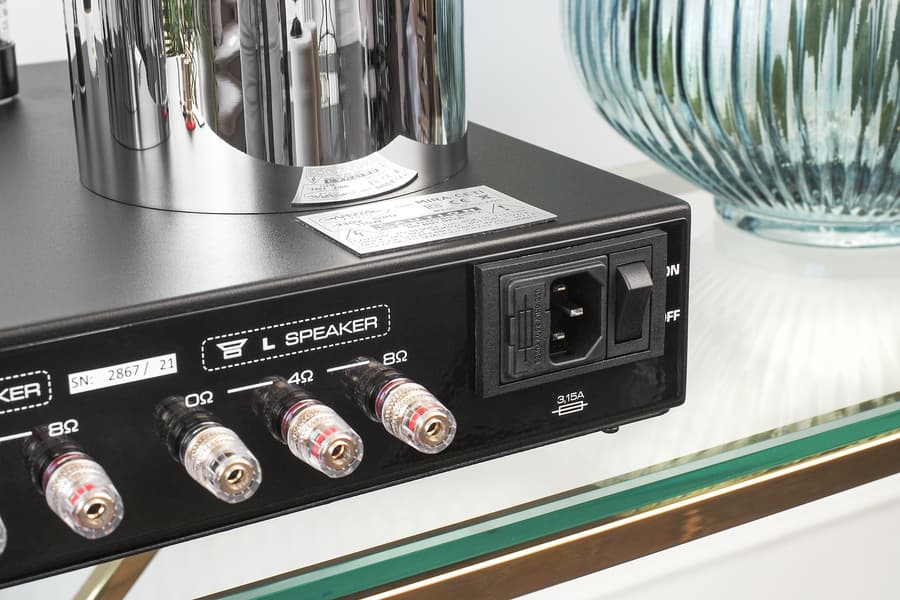 Далее подключаем кабель питания, но включим мы усилитель попозже — уже после окончания всех подготовительных работ и финального размещения. Устанавливать Fezz Audio Mira Ceti, как и прочие ламповые усилители, следует на верхней полке стойки, где лампам будет обеспечен хороший уровень вентиляции.
