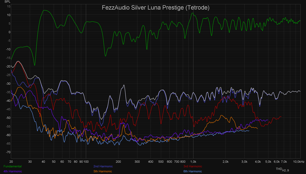 Вот тут разница уже есть, но хорошо заметно, что акустика и комната вносят куда больший вклад в звучание, чем усилитель. И вновь возникает вопрос: почему же звук ламповых усилителей многим людям нравится намного больше? Источников его окраски может быть два — АЧХ и гармонические искажения. С АЧХ разобрались: вряд ли источник «теплого лампового звука» кроется там. Остаются искажения. Заявленный КНИ у тестируемого сегодня Fezz Audio Silver Luna Prestige составляет менее 0,35%, а у Schiit Vidar — уже менее 0,01%, что как бы сразу намекает. Посмотрим на графики искажений при подключении каждого из усилителей.
