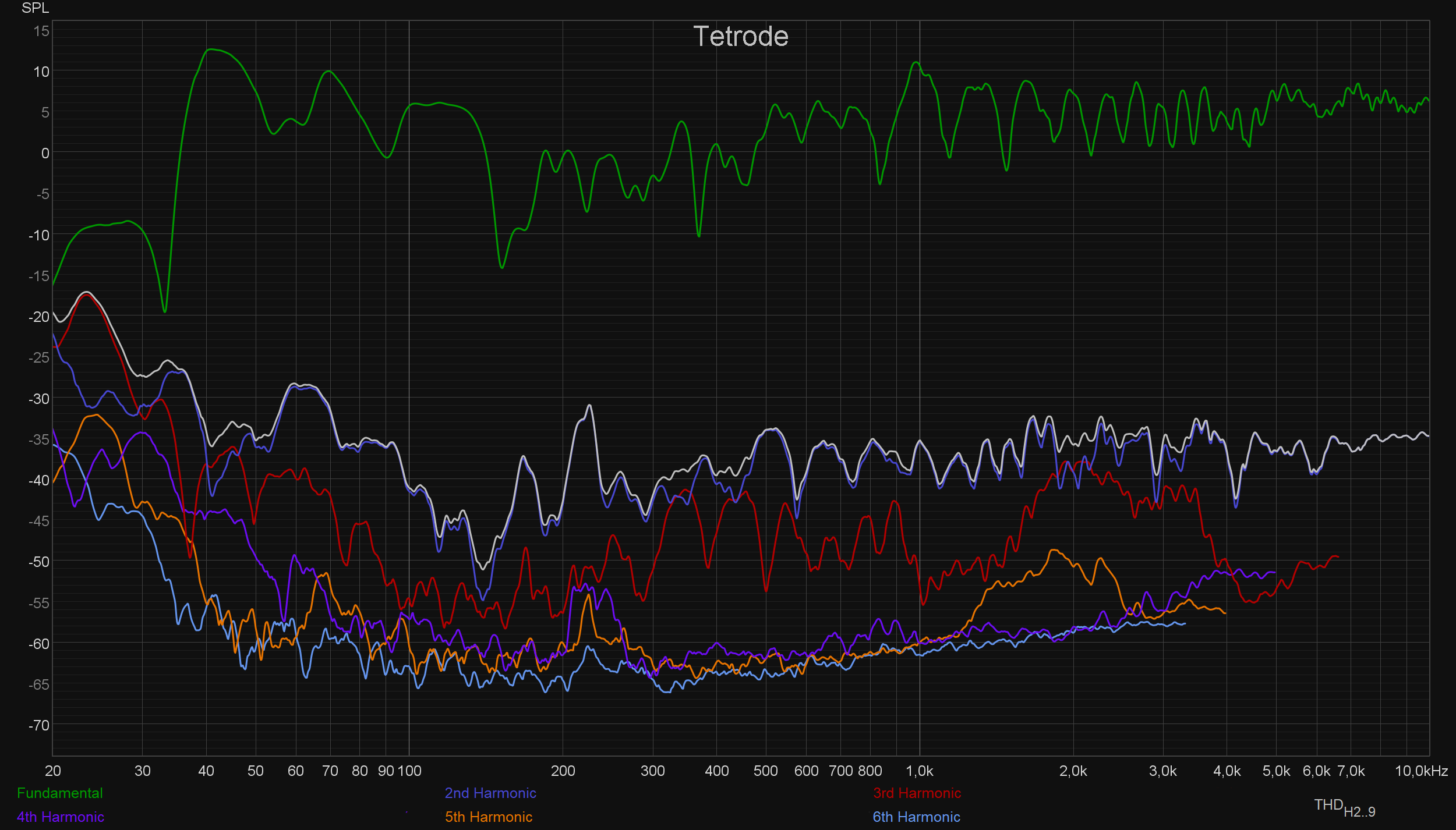 Все довольно наглядно. Считается, что четные гармоники воспринимаются человеком как благозвучные и приятные для слуха. Вот за счет их присутствия звук после лампового усилителя и приобретает характерную «теплую» окраску. Получается, что транзисторные усилители звучат намного «честнее», ну а ламповые — интереснее и благозвучнее. А уж что выбрать — тут решает слушатель. Напоследок сравним еще графики искажений в режиме тетрода и пентода. Как видно, различия есть — возможно, что не все впечатления от изменения режима являются надуманными, но тут уж не беремся судить.