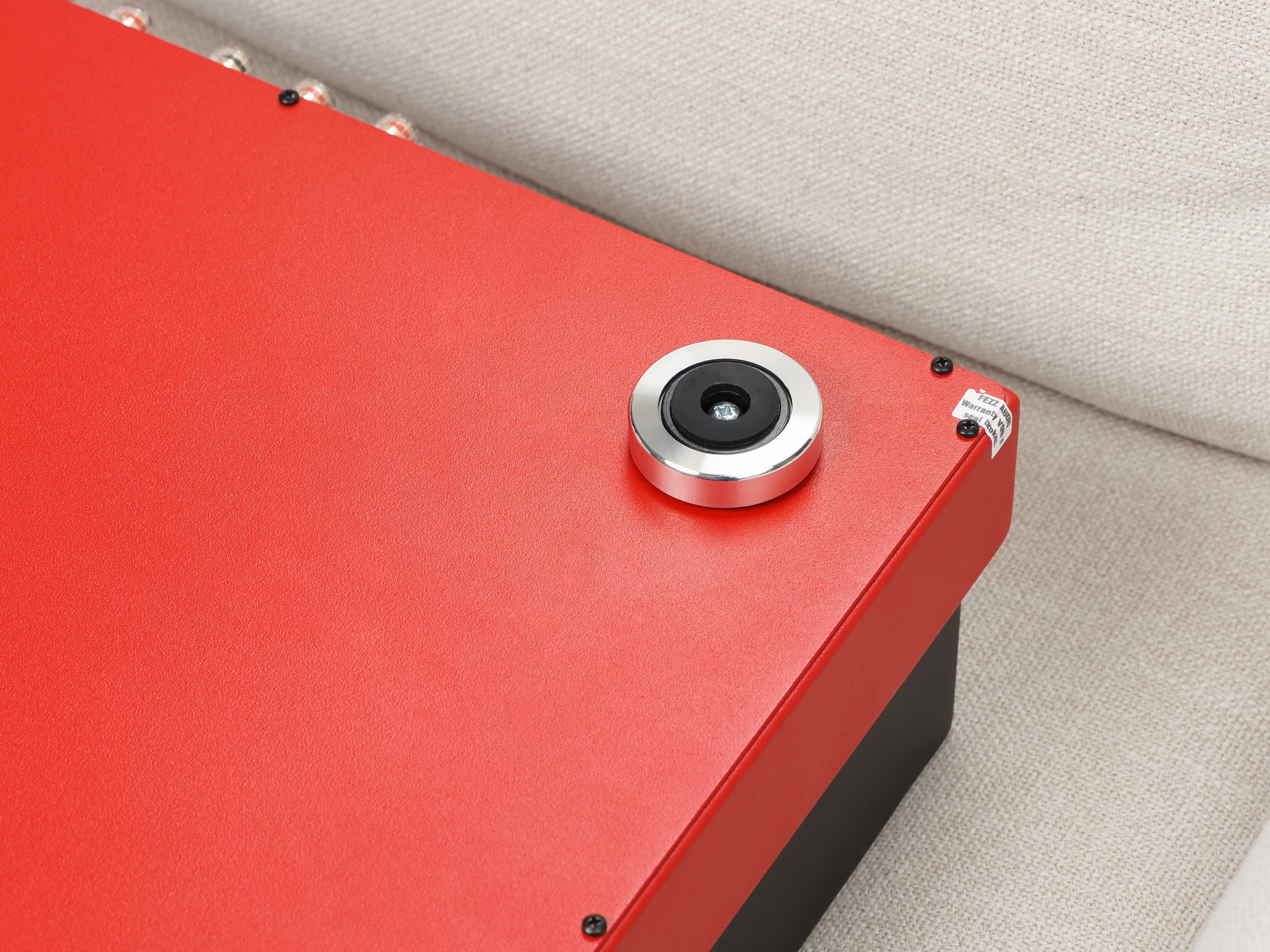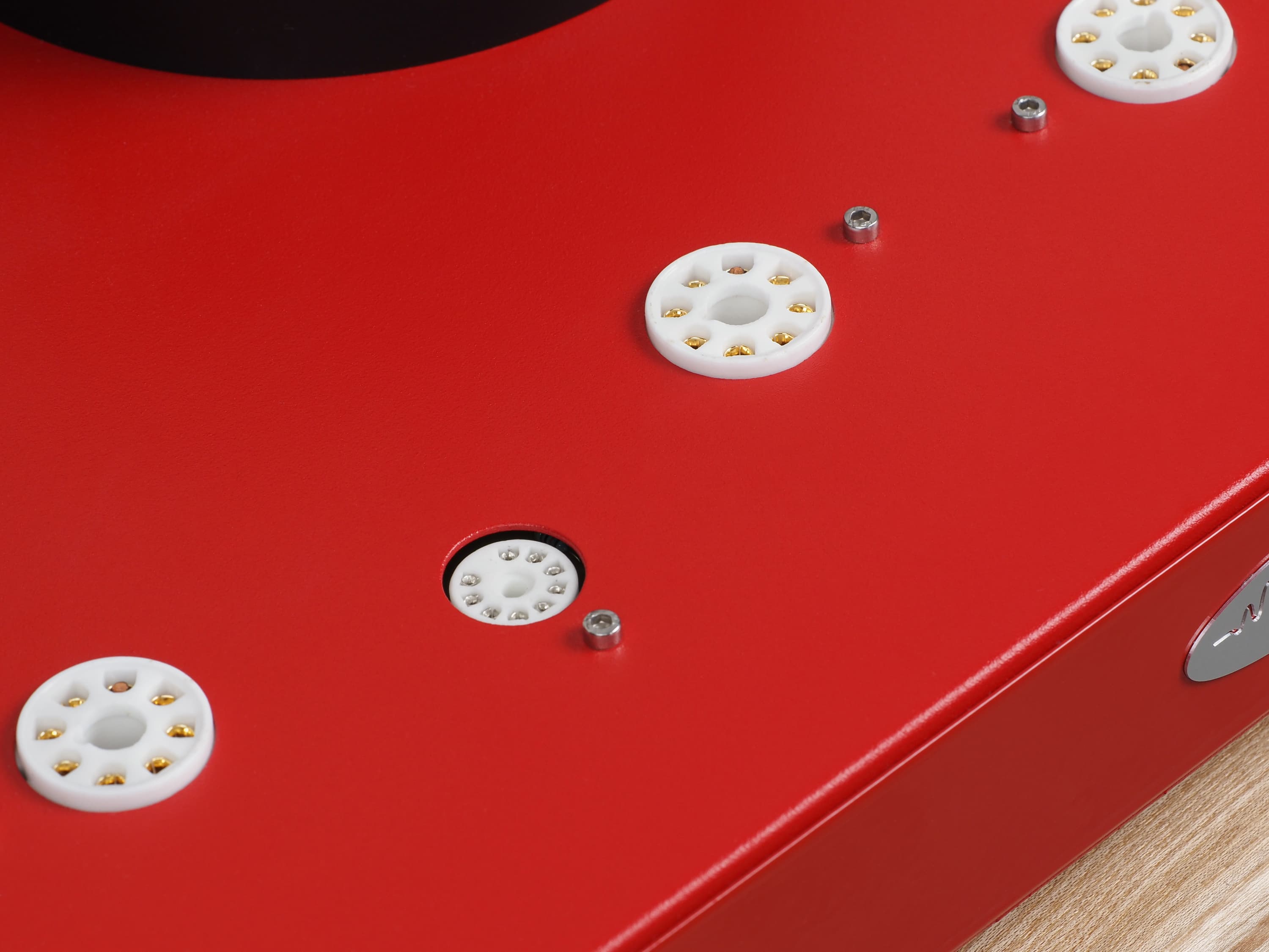 Усилитель поставляется в четырех цветовых вариациях: bleach (белая), big calm (бордовая), black ice (черная), burning red (красная). Мы для тестирования выбрали последнюю из перечисленных и самую эффектную. Выглядит Fezz Audio Titania отлично: основательно, с нотками винтажности — как и положено ламповому усилителю. От одного внешнего вида уже душа радуется — еще до включения питания. К качеству сборки, естественно, никаких вопросов — ничего не скрипит и не люфтит, солидный металлический корпус внушает уважение. На передней панели размещены две ручки — для управления громкостью и переключения входов.