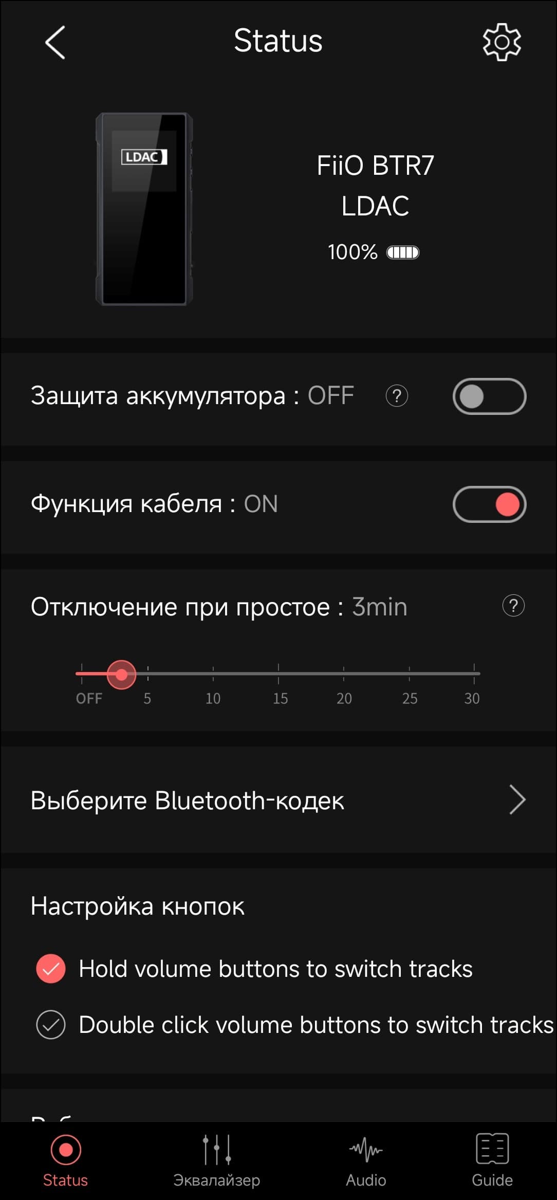 Выключателя режима зарядки очень не хватало в BTR5, приходилось постоянно обращаться к меню при использовании устройства в режиме проводного ЦАПа, который не должен потреблять заряд смартфона. Теперь он есть, причем организован максимально удобным образом.