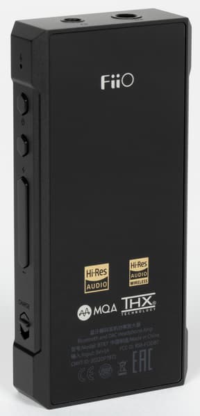 Размеры, как уже упоминалось выше, у FiiO BTR7 довольно солидные — 40×15×84 мм. Благодаря анодированному цельнометаллическому корпусу и крупному экрану устройство напоминает, скорее, небольшой плеер, чем привычный «цапоусилитель». На левом боку расположились кнопки управления и отверстие микрофона, на верхней грани — два разъема для подключения.