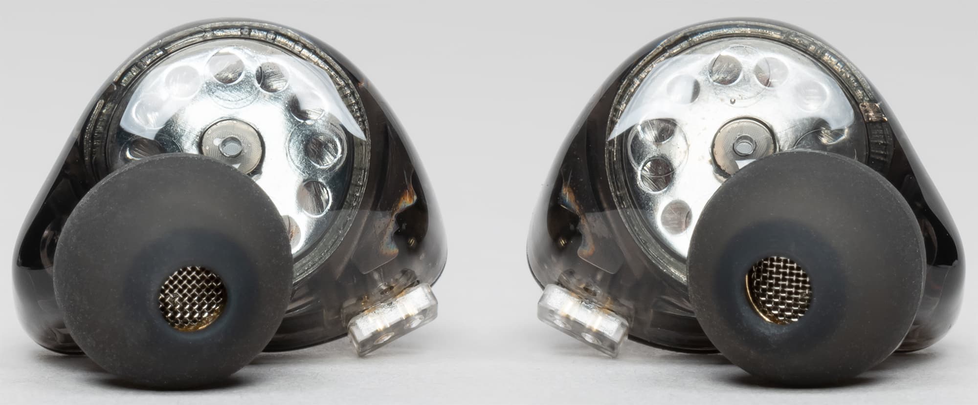 Сквозь боковые грани можно увидеть практически всю «начинку» FiiO FH1s. В нижней части расположены разъемы для подключения кабеля, возле которых нанесена маркировка «право»/«лево».