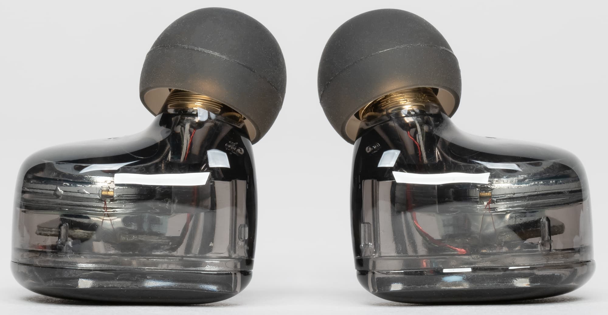 Через прозрачную внутреннюю стенку хорошо видны 13,6-миллиметровые динамические драйверы. Со внешней стороны корпус менее прозрачный благодаря перламутровой покраске с разводами. В реальности она не так заметна, как на фото, но все равно придает наушниками долю оригинальности.