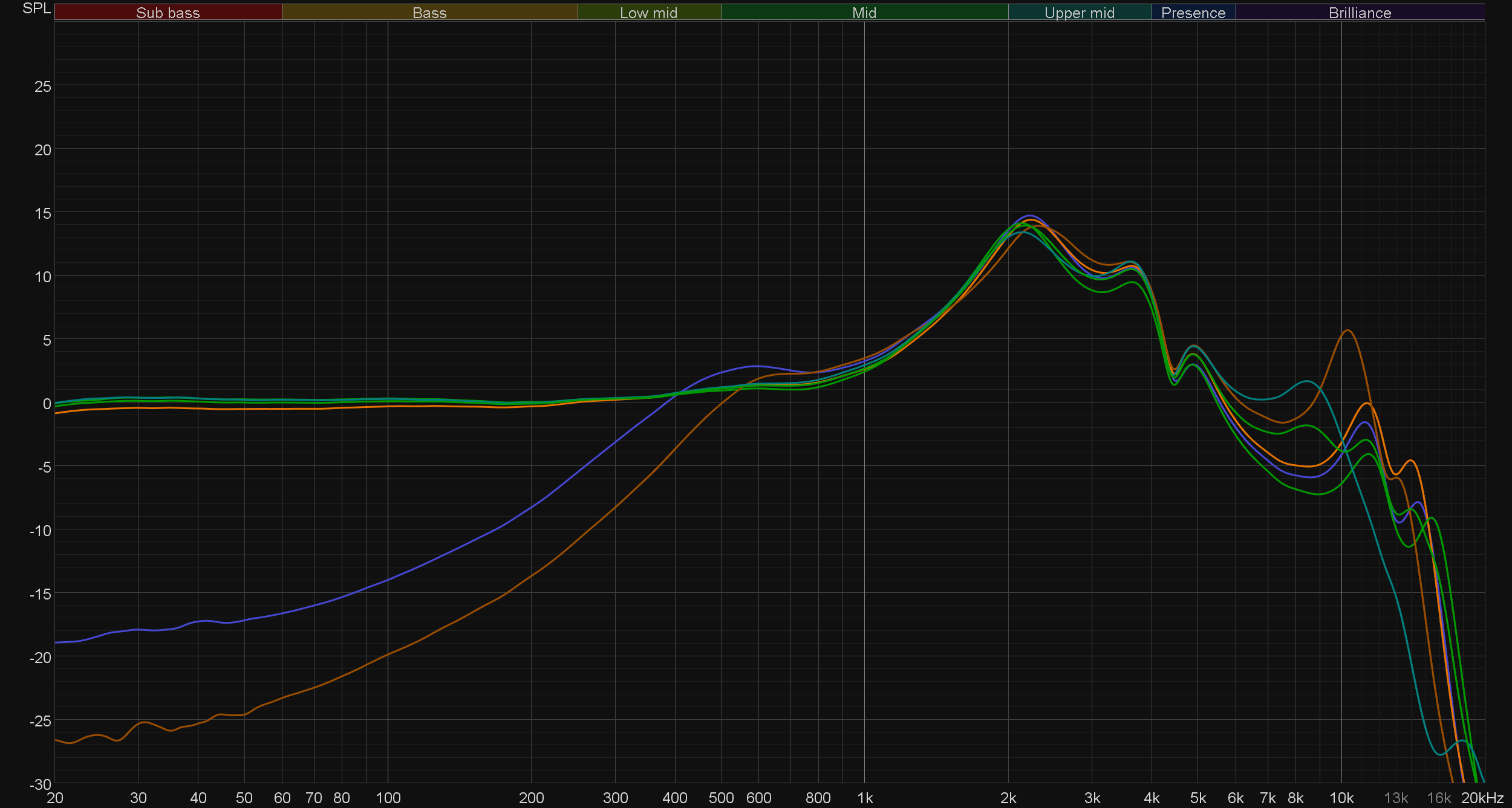 В очередной раз заметим, что на передачу низкочастотного диапазона крайне большое внимание оказывает подбор амбушюров. В качестве иллюстрации приведем графики, полученные с использованием различных пар амбушюров. Сознательно не будем уточнять, какие графики соответствуют каким парам — у каждого конкретного слушателя результат может быть свой. Нашему тестовому стенду явно «не подошли» два варианта, которые мы исключили из общей серии замеров. Остальные результаты были усреднены для получения графика АЧХ, представленного выше.