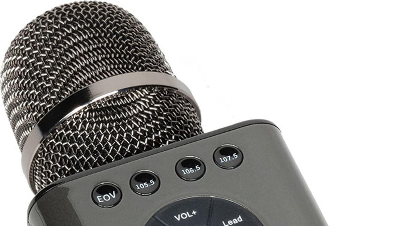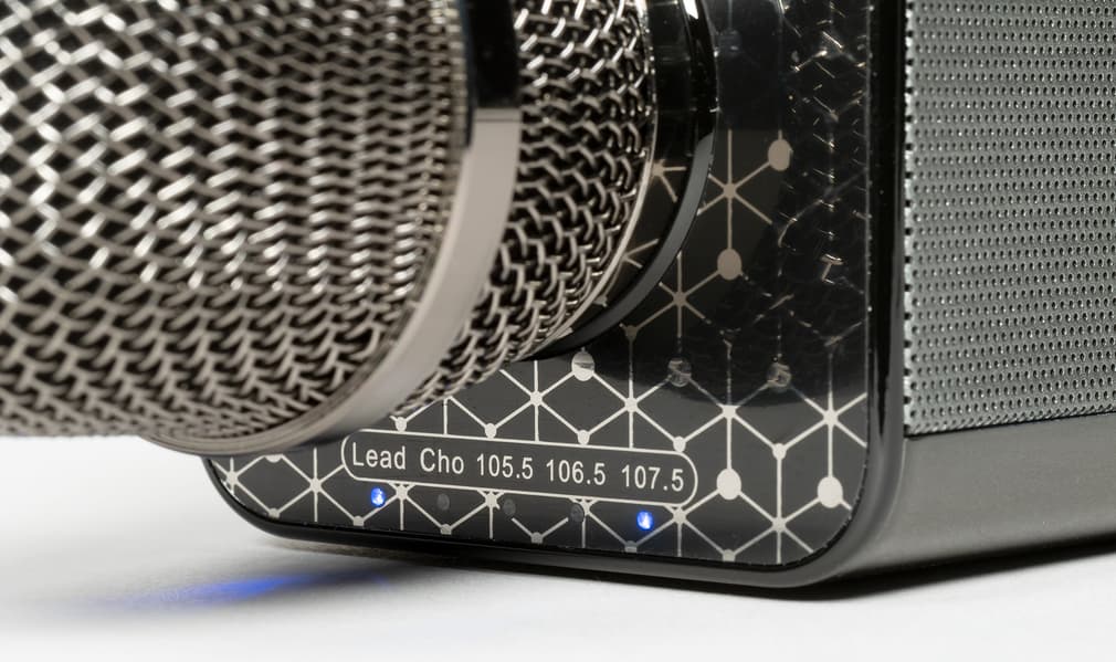 Во-вторых, можно связывать несколько микрофонов вместе для хорового пения. С помощью кнопок на передней панели активируем у основного микрофона режим Lead, запускаем с него фонограмму. А на остальных включаем режим Chorus и выбираем ту же частоту. Они будут получать фонограмму с ведущего устройства, а на него отдавать звук голоса. Ну а дальше — либо пользоваться встроенными динамиками, либо передать звук с основного микрофона дальше — на аудиосистему.