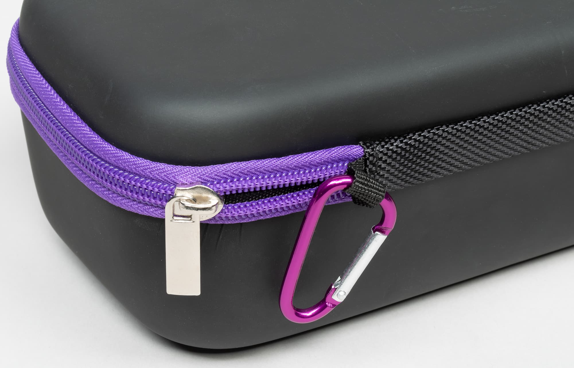 На тыльной стороне кейса находится небольшой карабин, с помощью которого его можно закрепить на рюкзаке, например.