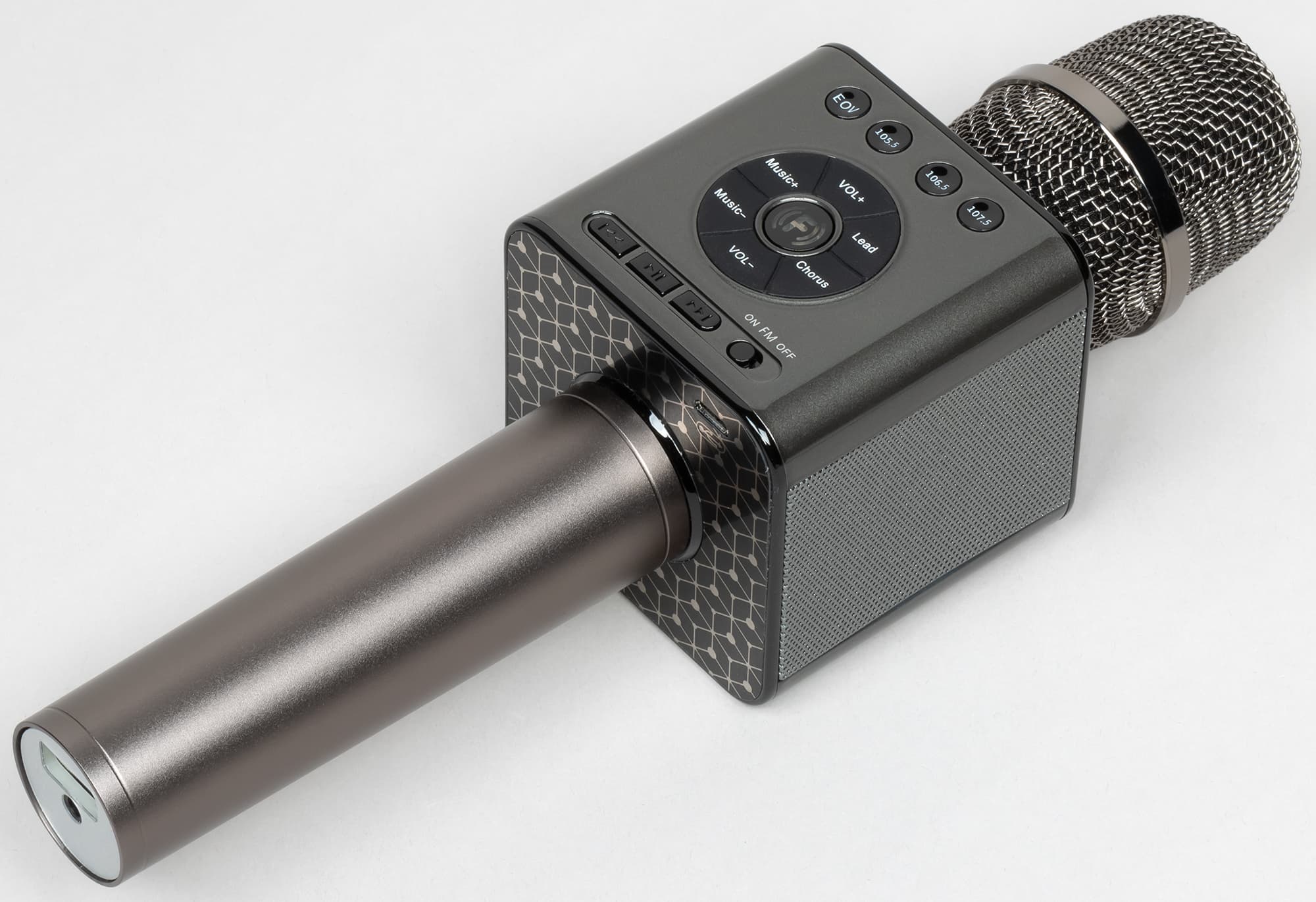 Микрофон закрыт металлической сеткой, на средней части сверху находятся светодиоды, демонстрирующие режим работы FM-передатчика, о котором мы еще поговорим чуть ниже. Торцевая часть ручки закрыта накладкой из белого пластика, на которую выведены разъемы USB и миниджек 3,5 мм.