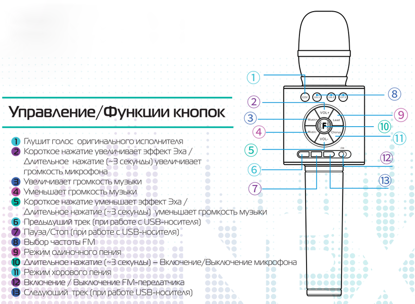 Свои действия и состояния микрофон озвучивает женским голосом с забавным акцентом. Управление осуществляется с помощью панели на одной из сторон «кубика». Кнопок немало, все функции описаны на иллюстрации ниже. Вот только в пункте №5, по всей видимости, сделана небольшая ошибка: длительное нажатие должно уменьшать громкость микрофона, а для управления громкостью фонограммы есть отдельные клавиши. Вообще же общие кнопки для управления громкостью микрофона и эффектом эха — не самая лучшая затея.