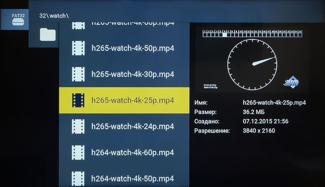 Прежде всего проведем традиционные тесты на корректное воспроизведение видео с разной частотой кадров. Плеер рассчитан на работу с видео 4K, но это не означает, что мы оставим без внимания «старомодное» Full HD. Запускать будем поочередно все тестовые файлы, имеющие частоту от 24 до 60 к/с. Для воспроизведения используем встроенный программный плеер с файловым браузером. Впрочем, других вариантов воспроизведения пользовательского локального контента приставка все равно не предлагает.