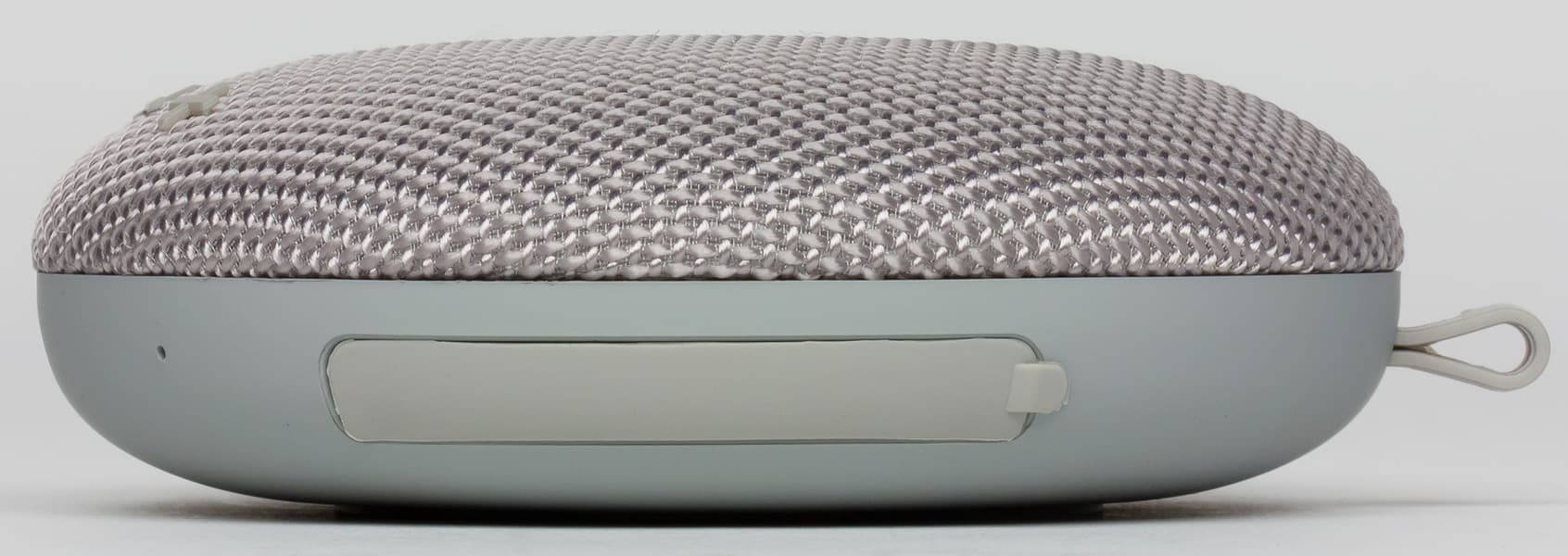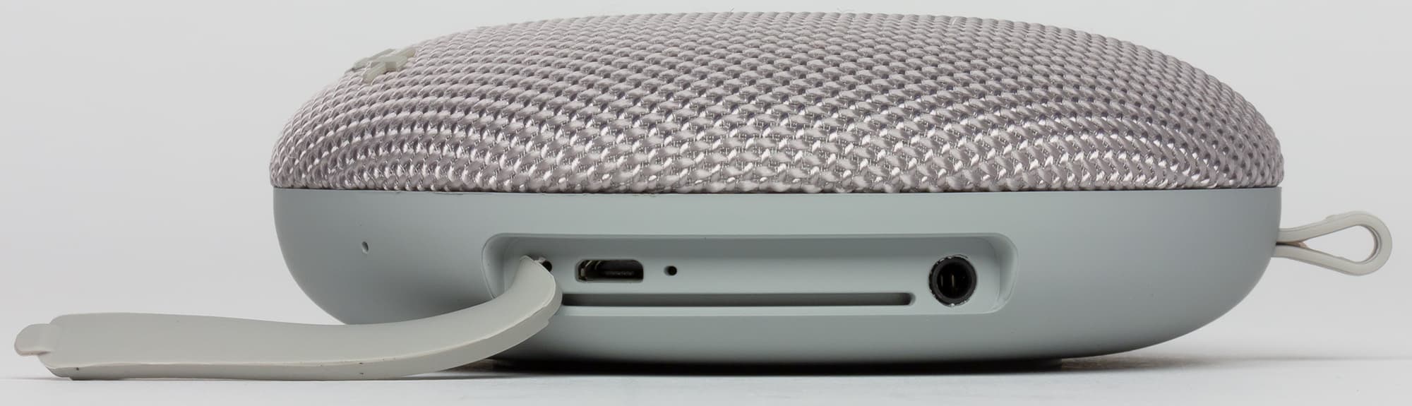Под заглушкой находятся: порт Micro-USB для зарядки, индикатор зарядки, аудиовход (миниджек 3,5 мм) для подключения проводного источника звука. Углубление для разъемов достаточно узкое — кабели с массивными штекерами могут не дотянуться до разъема. Однако с использованием комплектных кабелей никаких проблем нет.