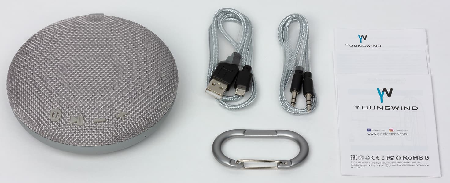 В комплекте идут: собственно беспроводная колонка, кабель Micro-USB для зарядки, кабель миниджек на миниджек для подключения проводного источника звука, карабин, инструкция пользователя и гарантийный талон.