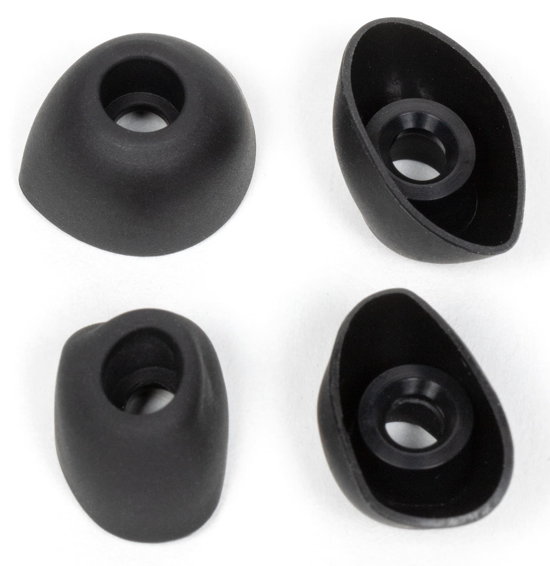 Силиконовые насадки надежно удерживаются с помощью выступа на конце звуковода, однако снимаются и ставятся на место без лишних усилий. В основании звуковода виднеется небольшое компенсационное отверстие, служащее для сброса лишнего давления во время работы динамического драйвера.