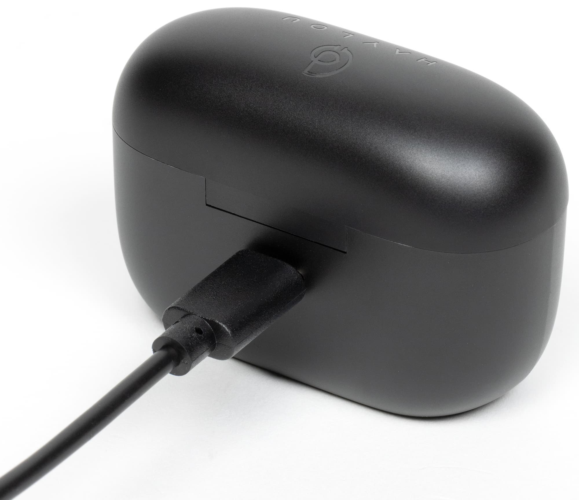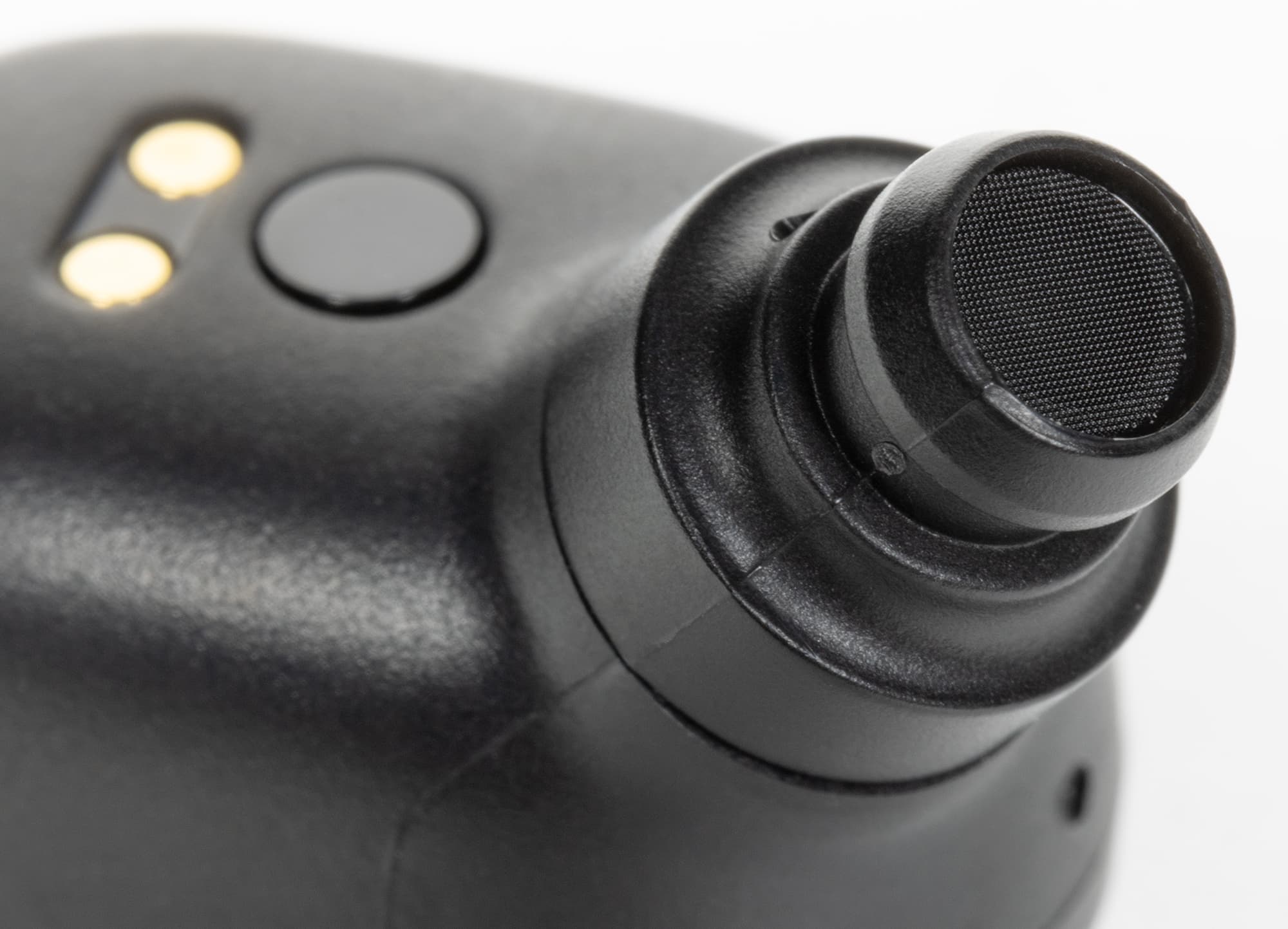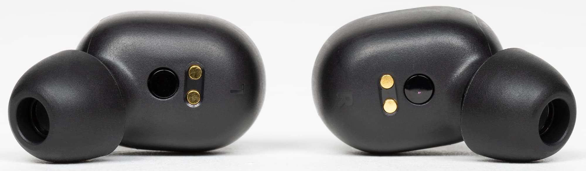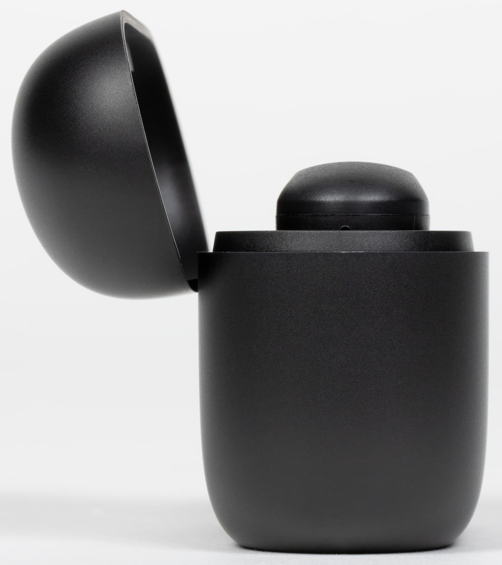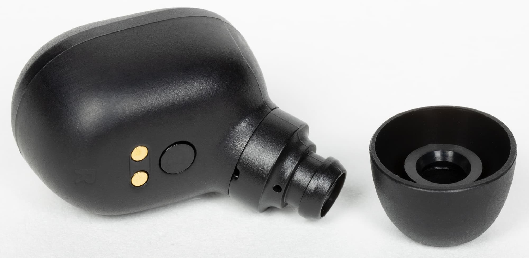 Звуковод выходит из корпуса чуть под углом, на обращенной к уху при ношении поверхности видны контакты для зарядки и окошки инфракрасных датчиков ношения.