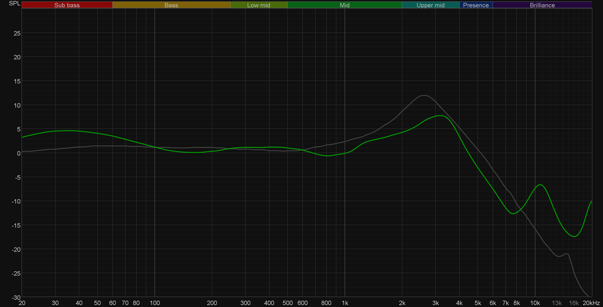 График АЧХ показан на фоне целевой кривой, предоставленной производителем используемого стенда. Она является адаптированным под конкретное устройство аналогом так называемой «кривой Хармана», созданной командой Harman International под руководством доктора Шона Олива. Люди неодинаково воспринимают звук разной частоты, поэтому даже самые точные измерения могут не соответствовать реальному пользовательскому опыту. Для компенсации этих различий и используется целевая АЧХ. Близкое к ней звучание оценивалось сотнями участников экспериментов как нейтральное, сбалансированное, естественное и так далее.