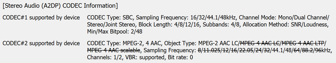 Полный список поддерживаемых кодеков и их режимов мы традиционно получили с помощью утилиты Bluetooth Tweaker. Кодеков два — SBC и AAC, что является стандартным минимальным набором для бюджетной гарнитуры.