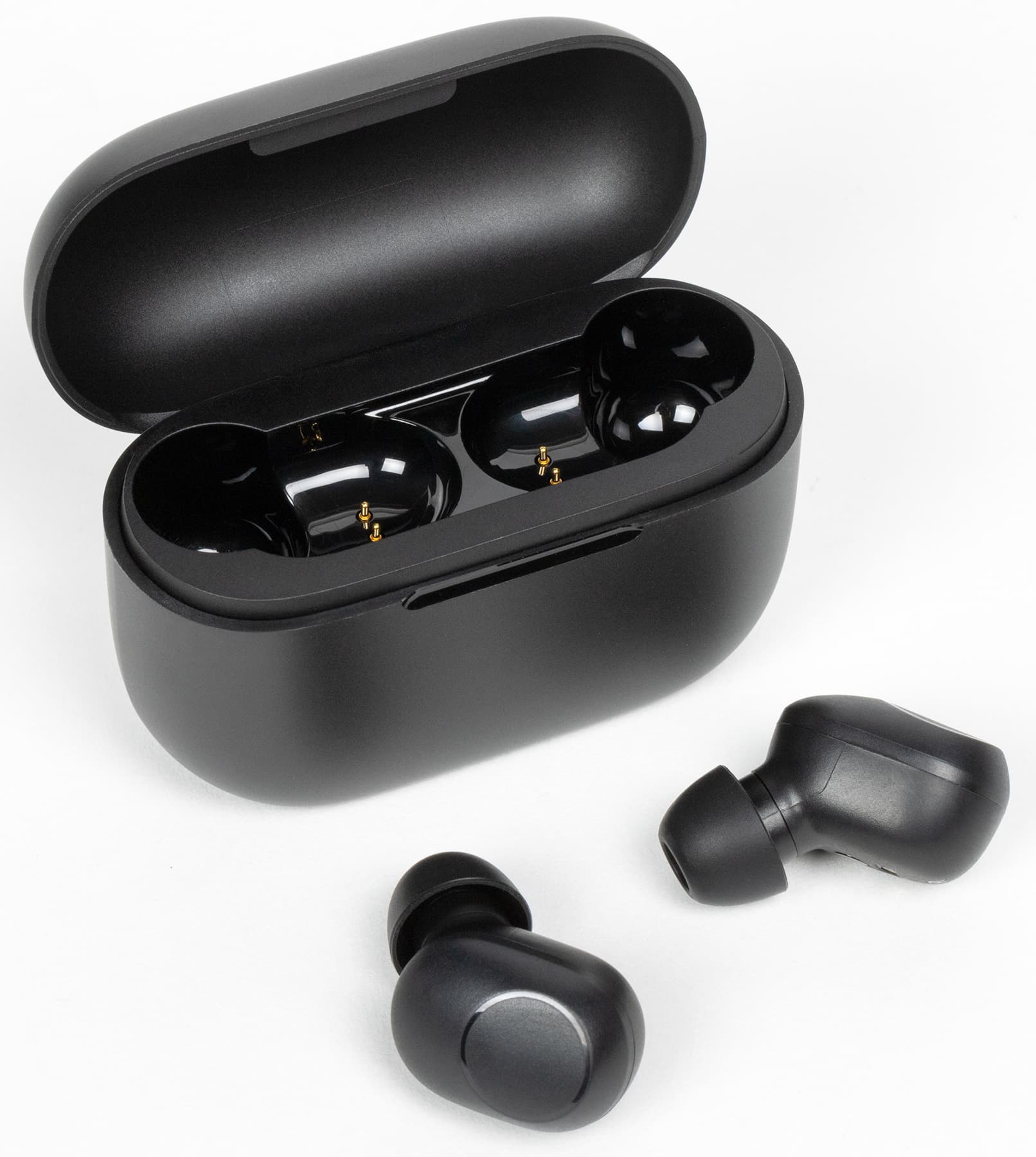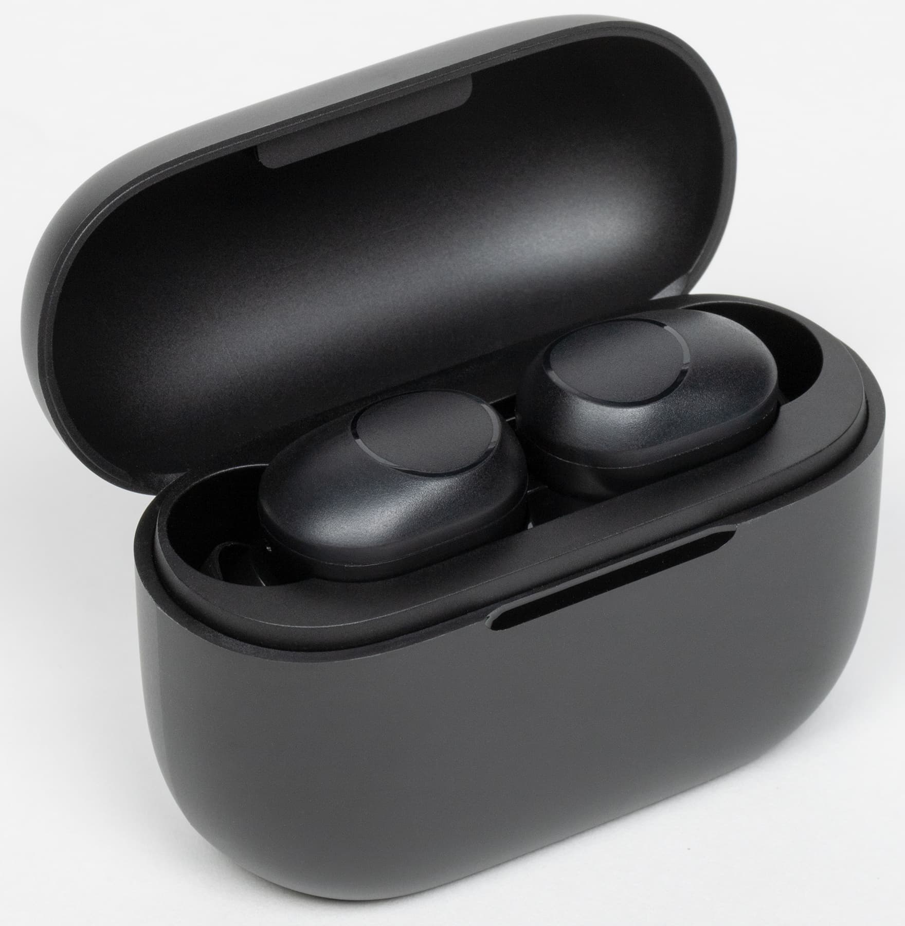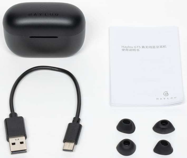 В комплект входят наушники в кейсе для зарядки, две пары силиконовых насадок (одна установлена по умолчанию), документация и кабель USB-A — USB-C длиной 15 см.