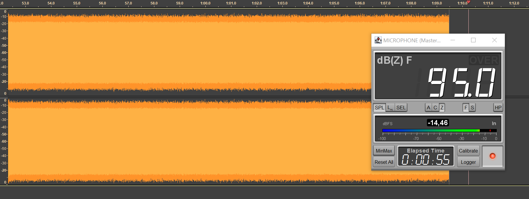 Производитель заявляет до 4 часов автономной работы Haylou GT5, что на сегодняшний день является средним для недорогих TWS-гарнитур показателем. Вкратце напомним нашу методику тестирования времени работы беспроводных наушников. Безопасным уровнем звукового давления при прослушивании музыки считается 75 дБ, но на практике большинство слушателей предпочитает уровень 90-100 дБ. Мы транслируем в наушники белый шум, фиксируя уровень SPL в районе 95 дБ, сразу после старта воспроизведения запускаем запись сигнала с измерительного стенда — по длине получившегося трека легко понять, сколько проработал каждый из наушников.