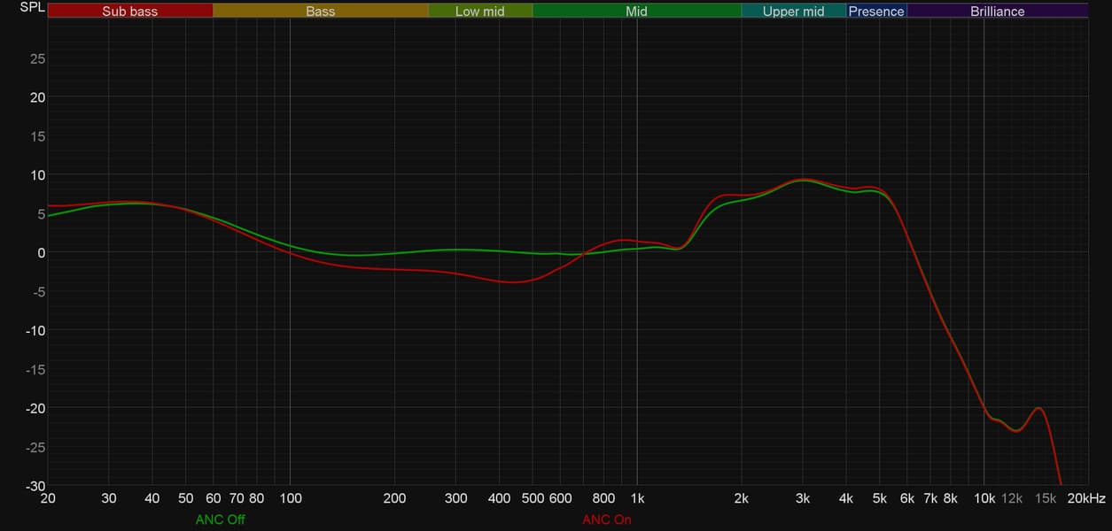 Включение активного шумоподавления изменяет АЧХ наушников — в частности, появляется небольшой провал в нижней середине. Но ничего сверхстрашного все же не происходит, звук остается сбалансированным.