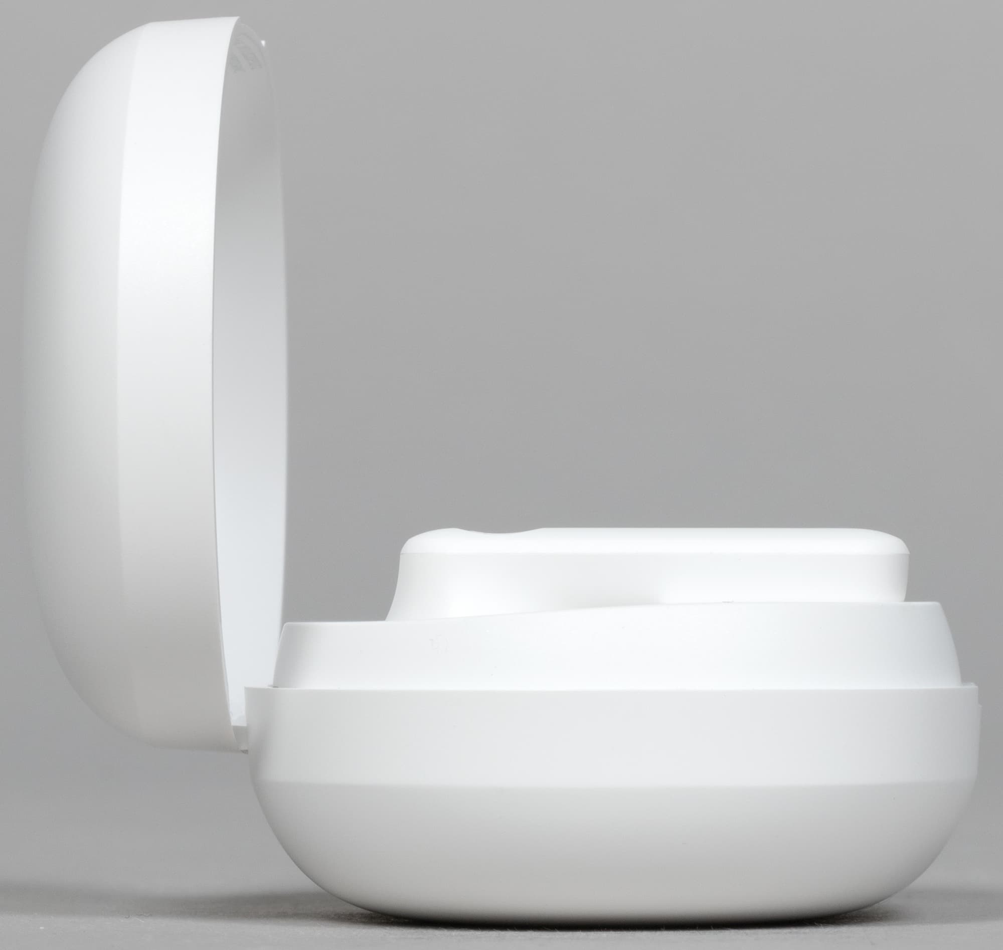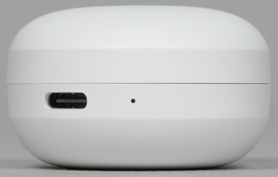 Внутри слотов для наушников видны подпружиненные контакты для зарядки, на основание крышки изнутри нанесены данные об устройстве и логотипы систем сертификации. Поверхность углублений сделана из глянцевого пластика, легко «собирающего» отпечатки пальцев — к нему лучше не прикасаться.