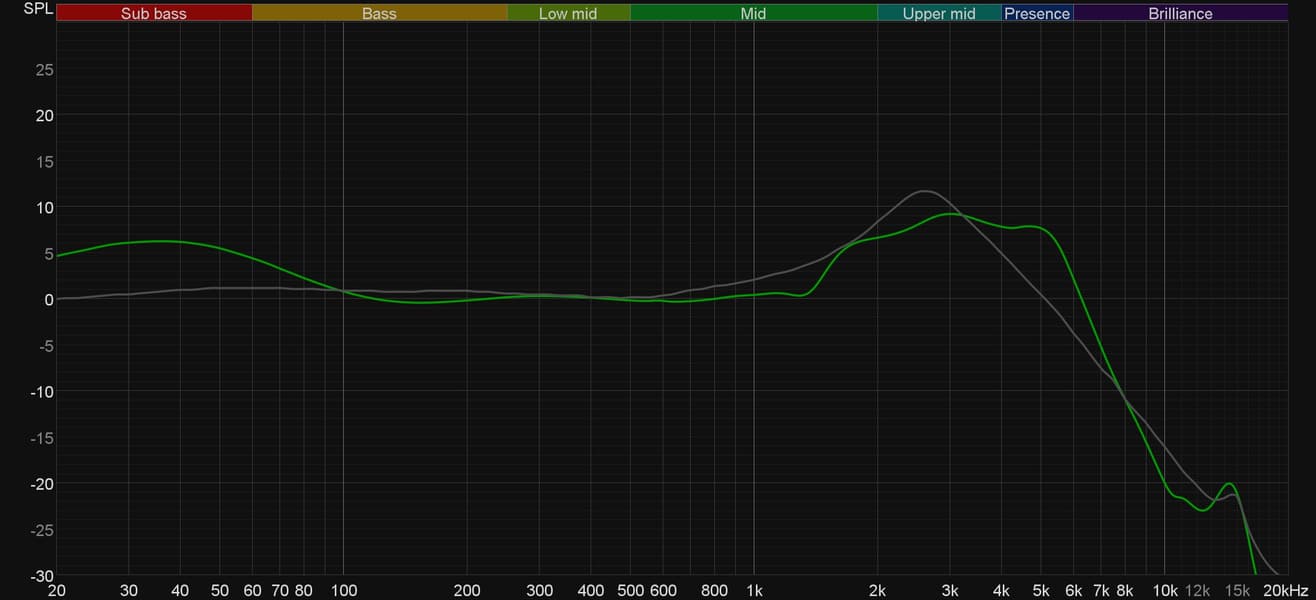 График АЧХ показан на фоне целевой кривой, предоставленной производителем используемого стенда. Она является адаптированным под конкретное устройство аналогом так называемой «кривой Хармана», созданной командой Harman International под руководством доктора Шона Олива. Люди неодинаково воспринимают звук разной частоты, поэтому даже самые точные измерения могут не соответствовать реальному пользовательскому опыту. Для компенсации этих различий и используется целевая АЧХ. Близкое к ней звучание оценивалось сотнями участников экспериментов как нейтральное, сбалансированное, естественное и так далее.