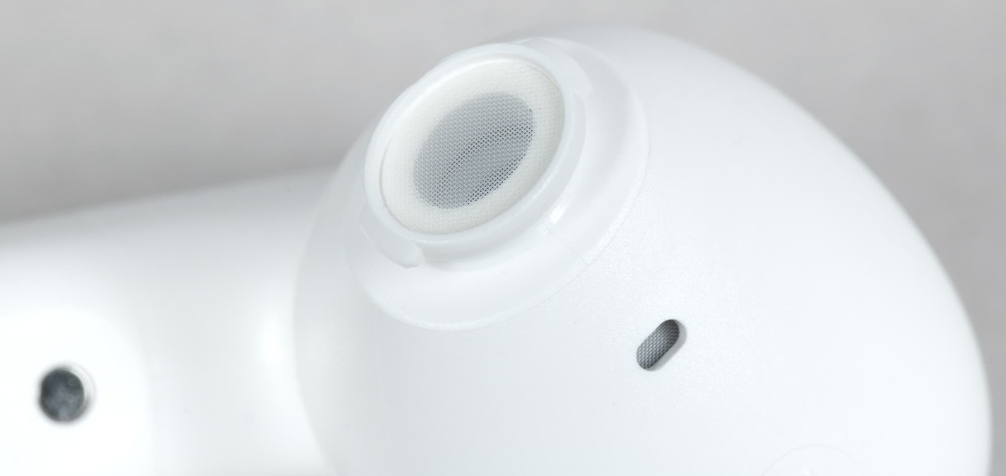 Отверстие звуковода прикрыто пластиковой сеточкой, рядом с ним находится компенсационное отверстие, служащее для сброса лишнего давления при работе динамического драйвера.